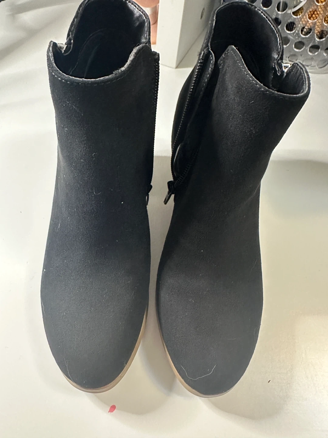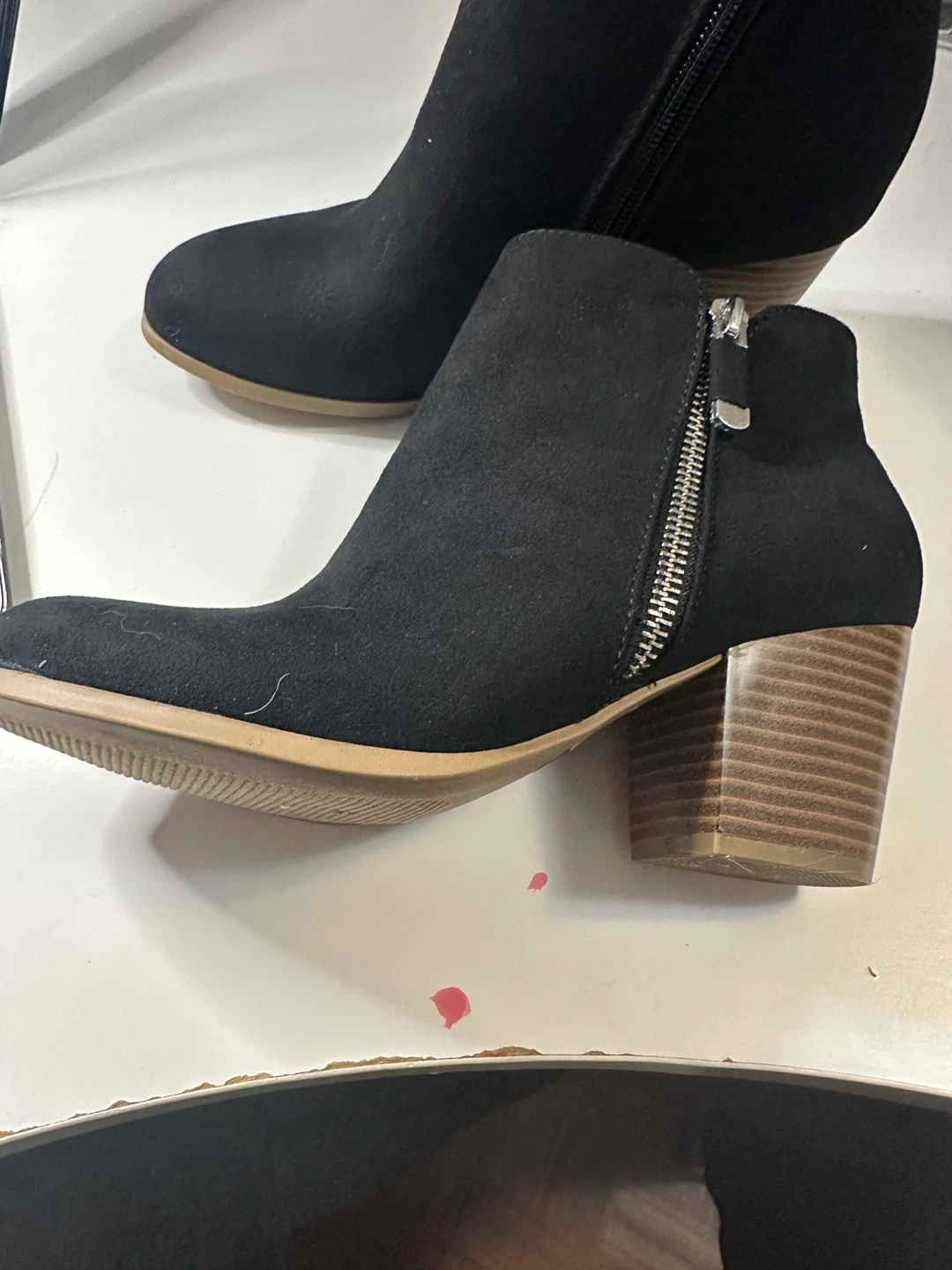 Black ankle boots with a suede-like finish. Features a side zipper for easy on and off. The block heel has a wood-grain look.