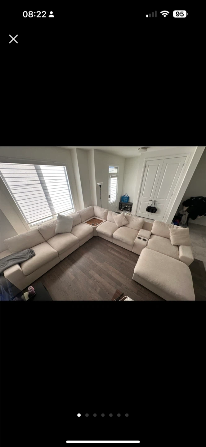This is a large U-shaped sectional sofa in a light beige fabric. It includes multiple seating modules and a matching ottoman. The sectional also features cup holders and a built-in tray. It's a great piece for a spacious living room!