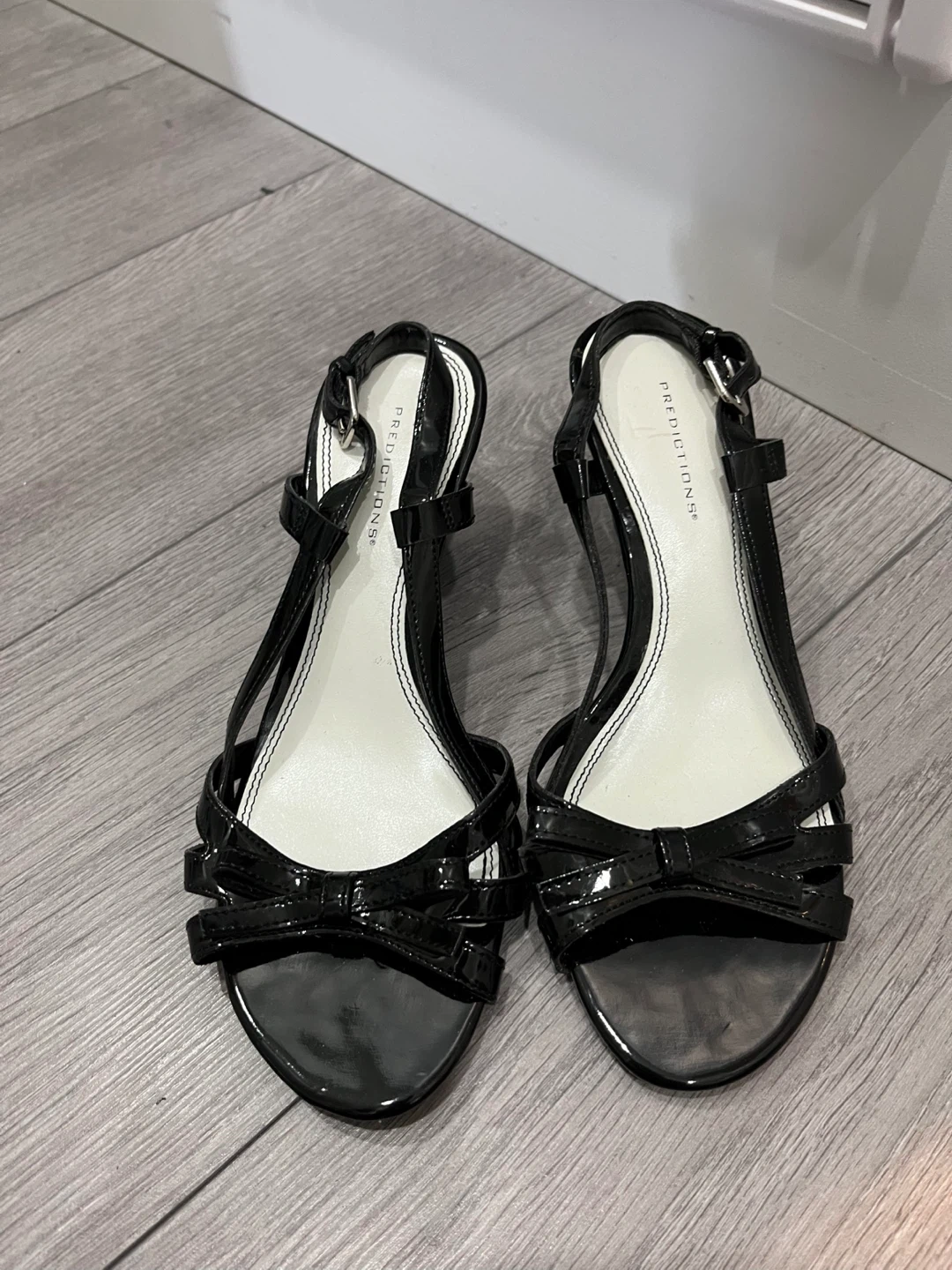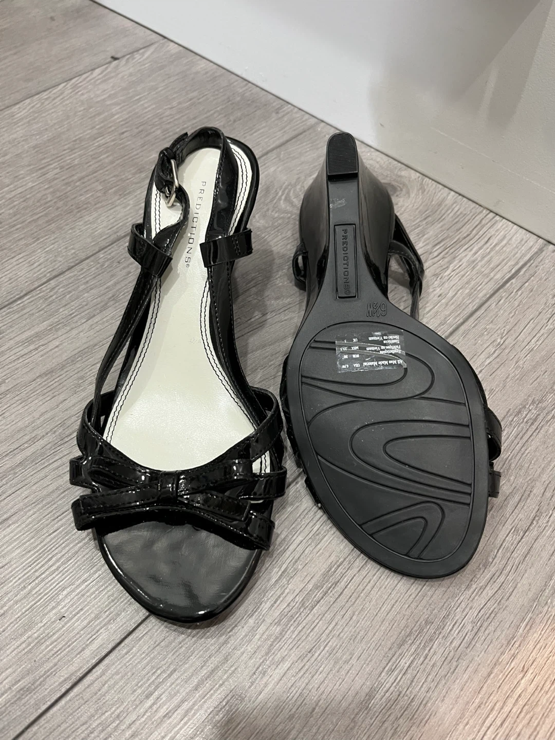 Predictions black patent wedge sandals. Features buckle ankle strap and decorative bow detail. Size is 6.5.