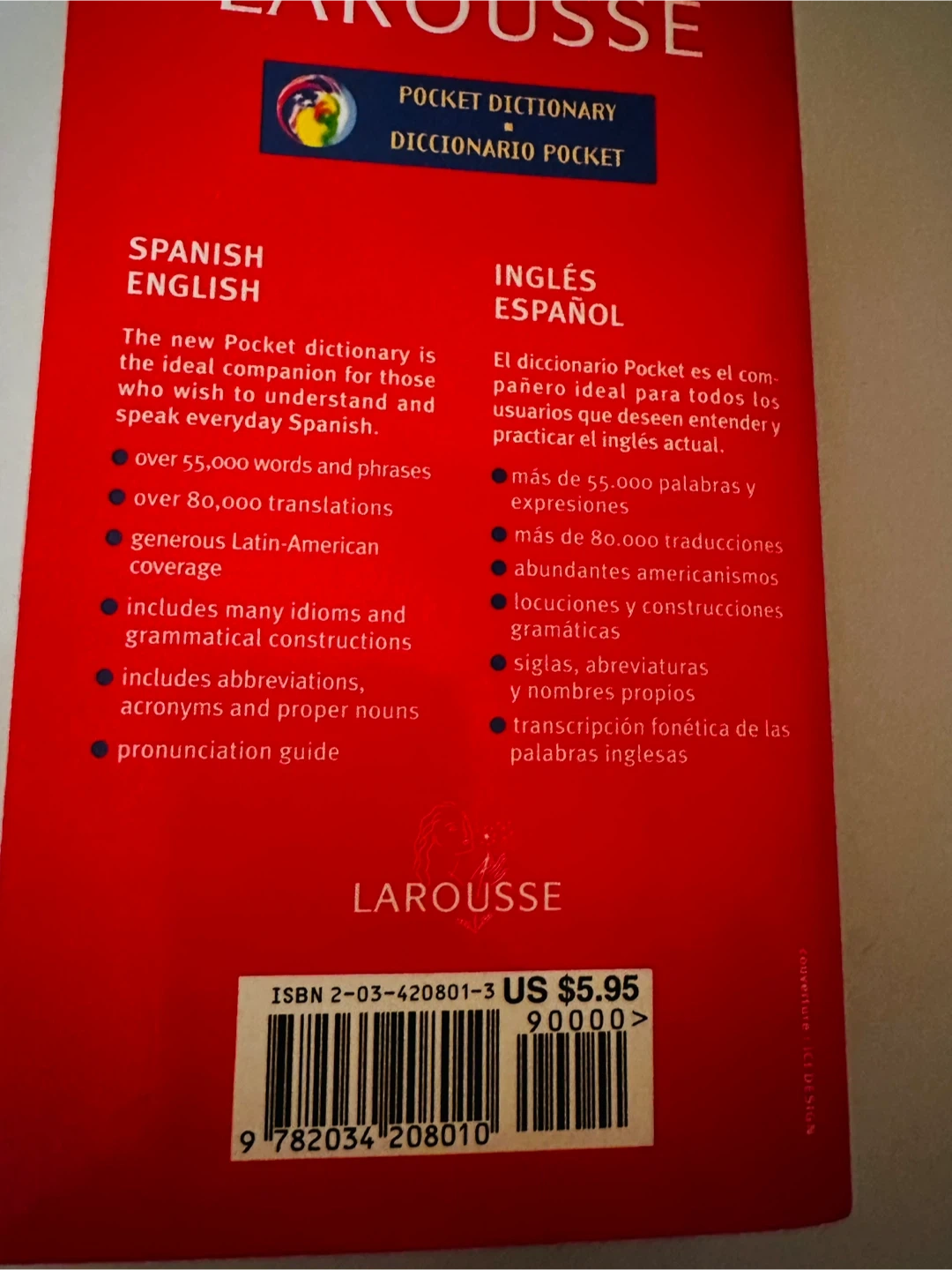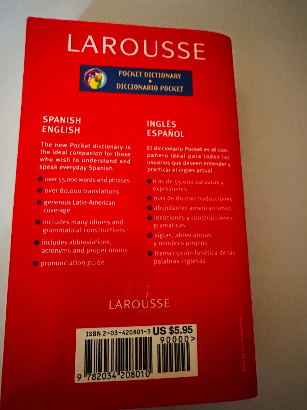 This Larousse Pocket Dictionary contains over 55,000 words and phrases and over 80,000 translations. It includes generous Latin-American coverage, many idioms, grammatical constructions, abbreviations, acronyms, proper nouns, and a pronunciation guide. This book's compact size makes it great for on-the-go use!