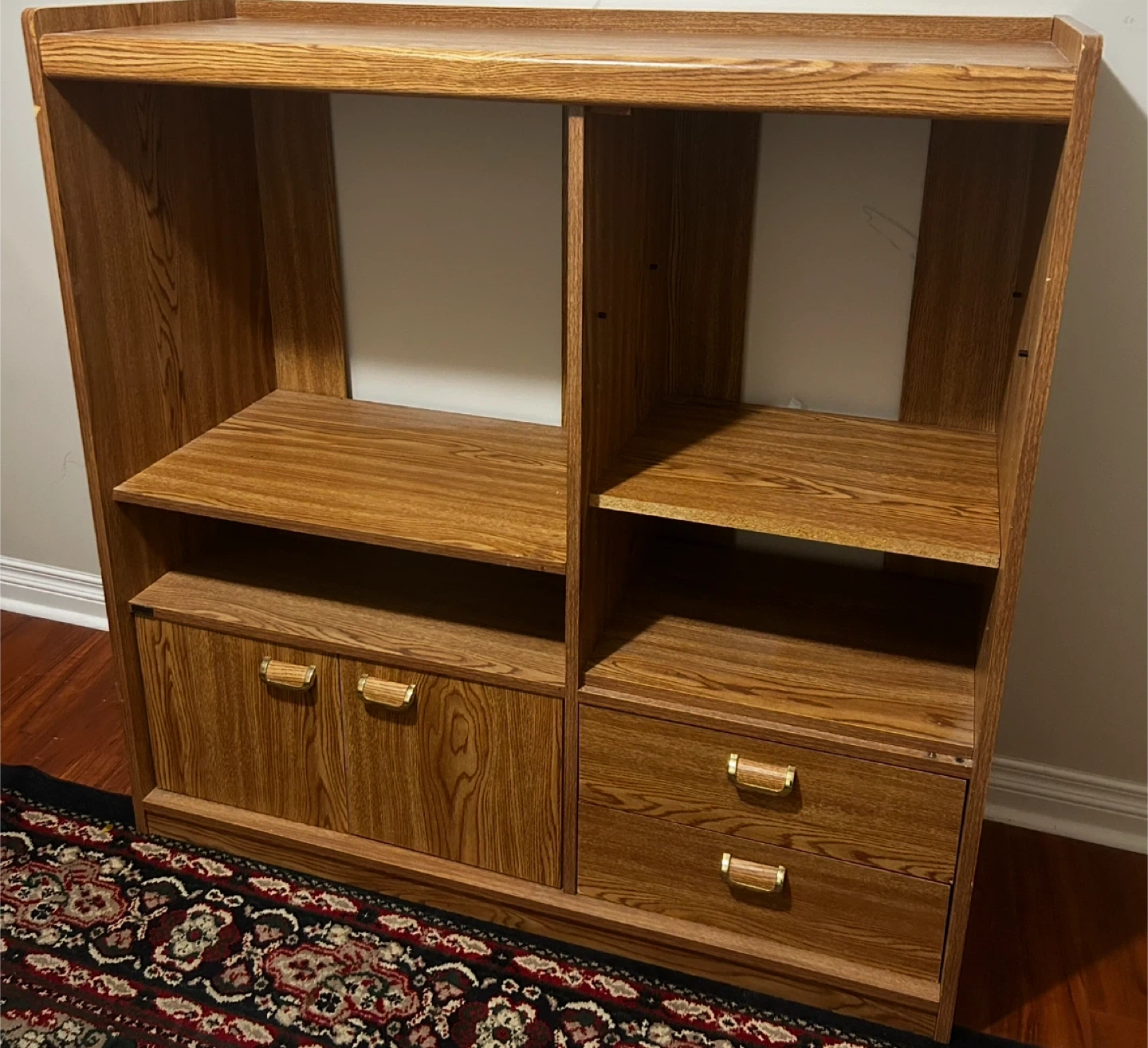 Selling a wooden TV unit with drawers. It has a warm, natural finish and offers a good amount of storage space with both shelves and drawers. Perfect for organizing books, decor, or other items!