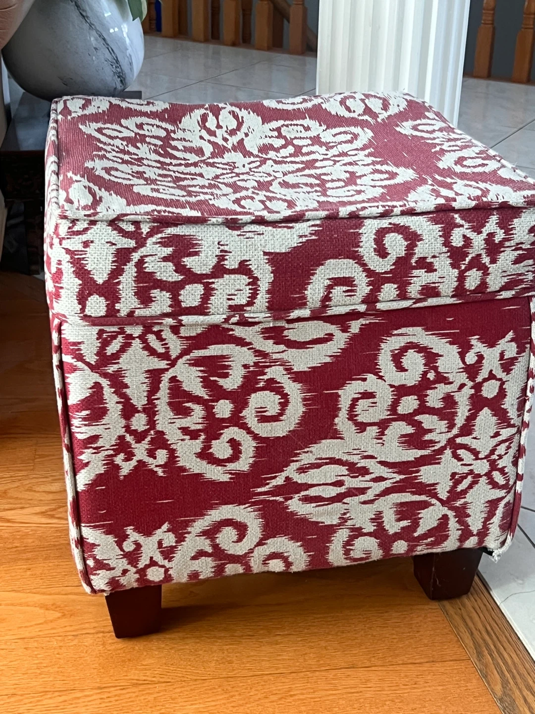This ottoman features a decorative red and white ikat-style pattern on its fabric upholstery. It's supported by four short, dark wooden legs. Upholstered in fabric. Has wooden legs.