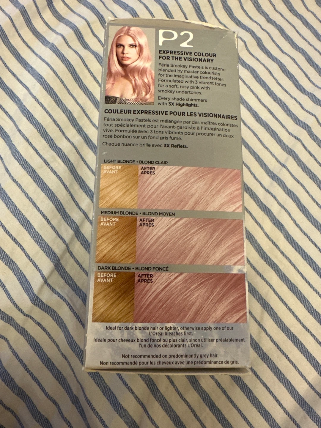 This is a L'Oréal Paris Feria Smokey Pastels hair colour kit in shade P2. It's formulated with 3 vibrant tones and smokey undertones. Provides multi-faceted shimmering colour with 3X highlights.