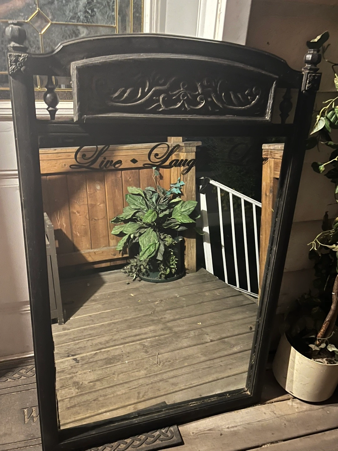 Black antique mirror with a decorative design. The mirror is in good condition. Either dresser top or hang on wall. Mirror is solid and heavy. Originally dark brown wood, painted black.