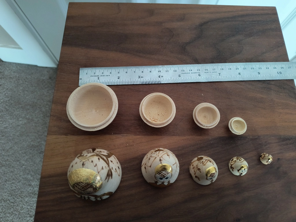Set of nesting dolls. Each doll has gold accents on the front. The dolls are all in good condition with no chips or cracks.