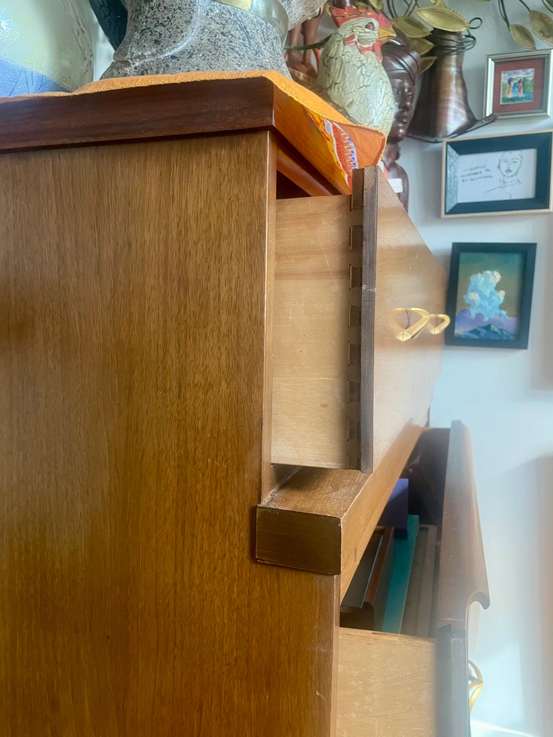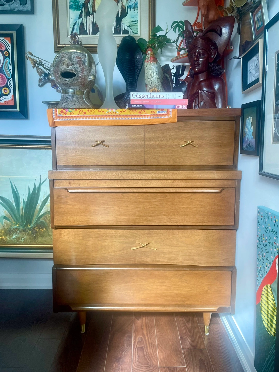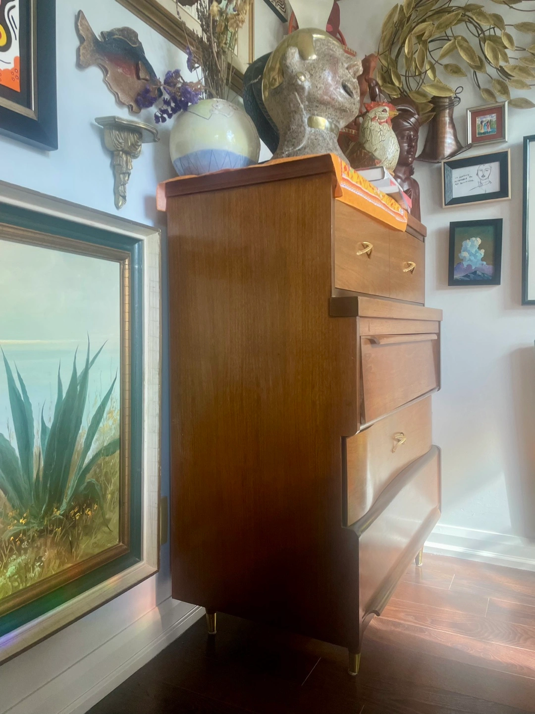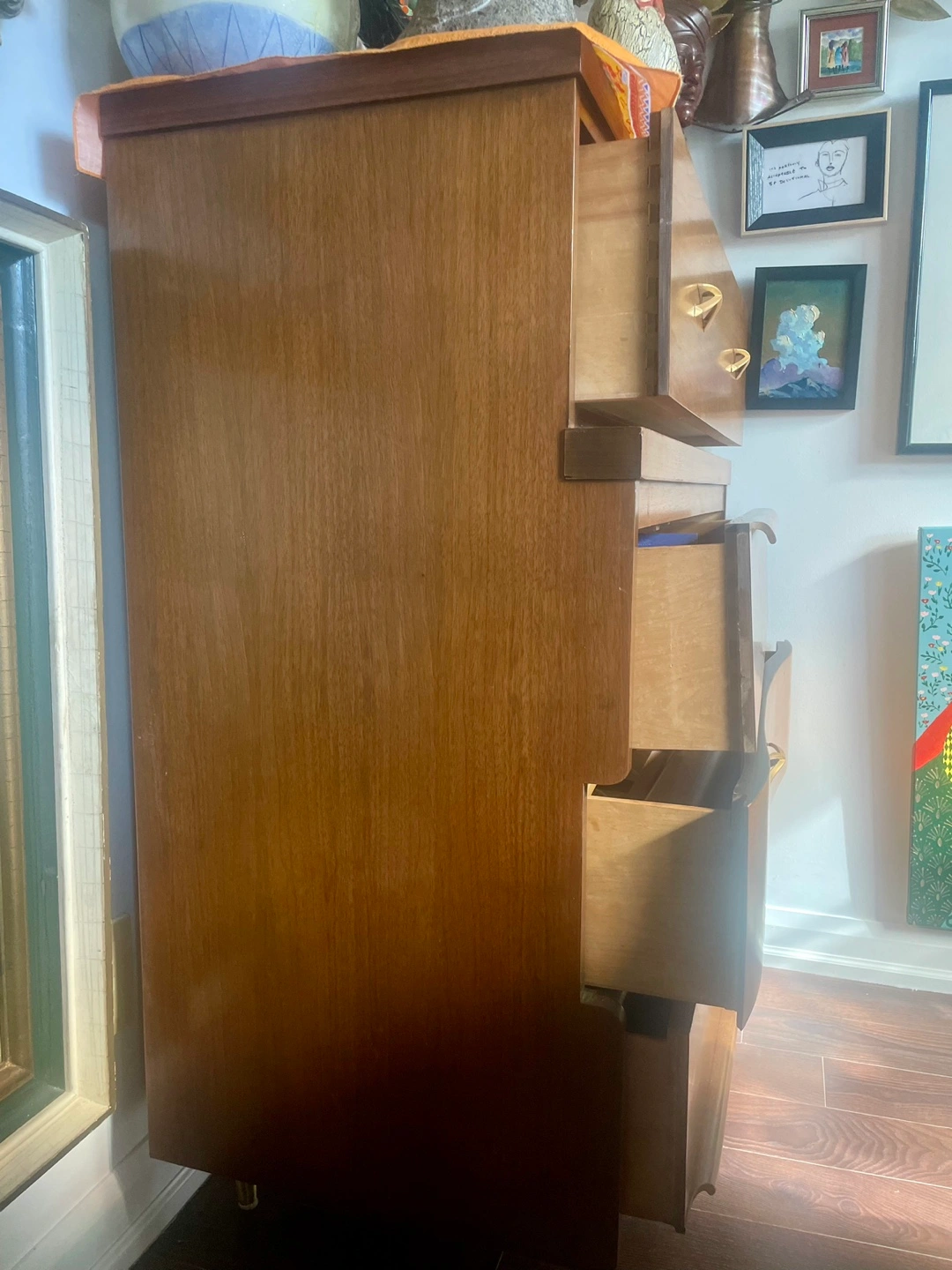 MCM Vic Art tallboy dresser, likely walnut, with four dove tail joint drawers. The dresser sits on tapered legs, accented with brass tips. Overall great condition, with some wear consistent with age. 34” W x 16” D x 43” H Pick up around Sherbourne/ Wellesley