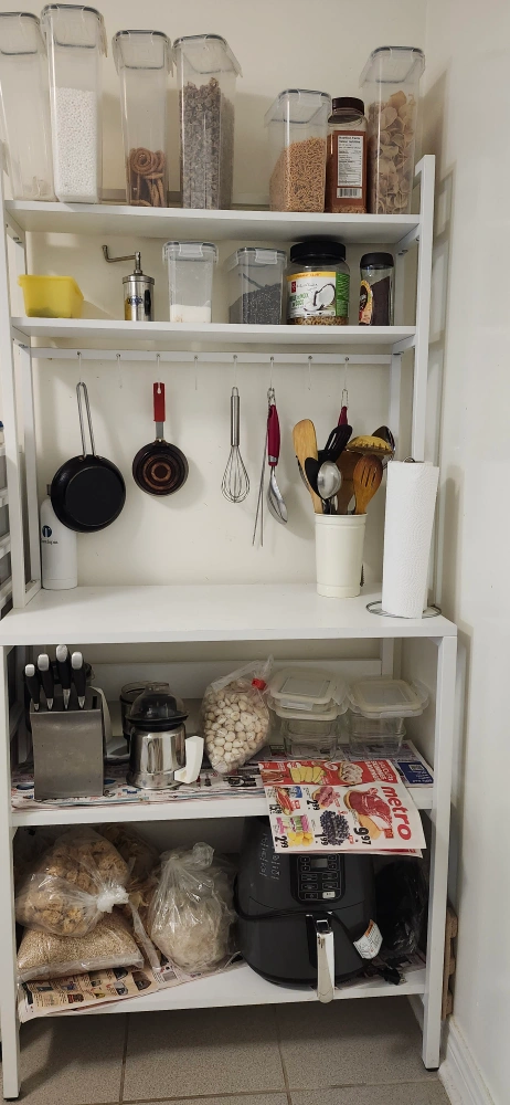 White metal shelf unit with three shelves. Includes hooks for hanging utensils, a small holder for utensils, and a top surface.