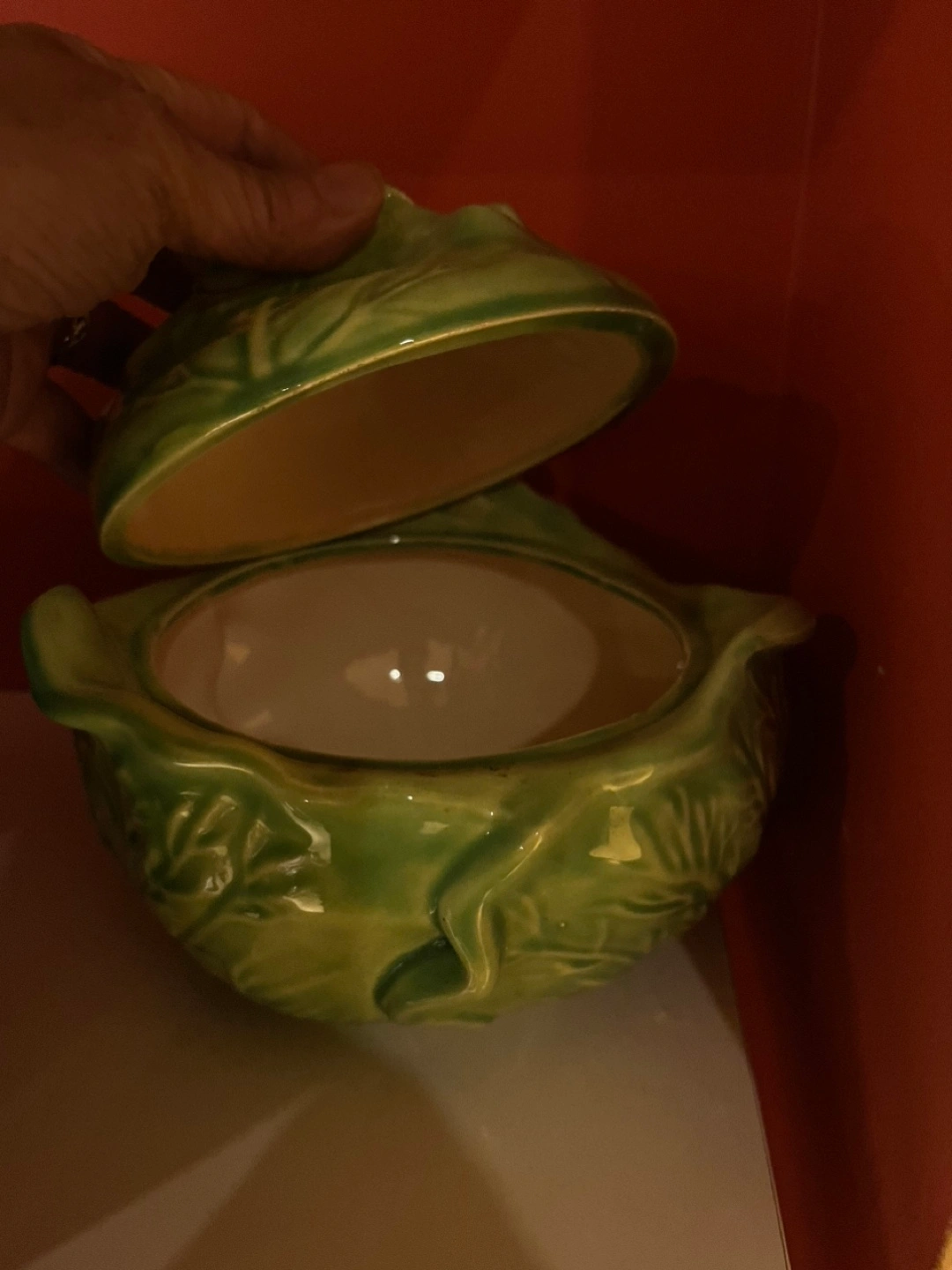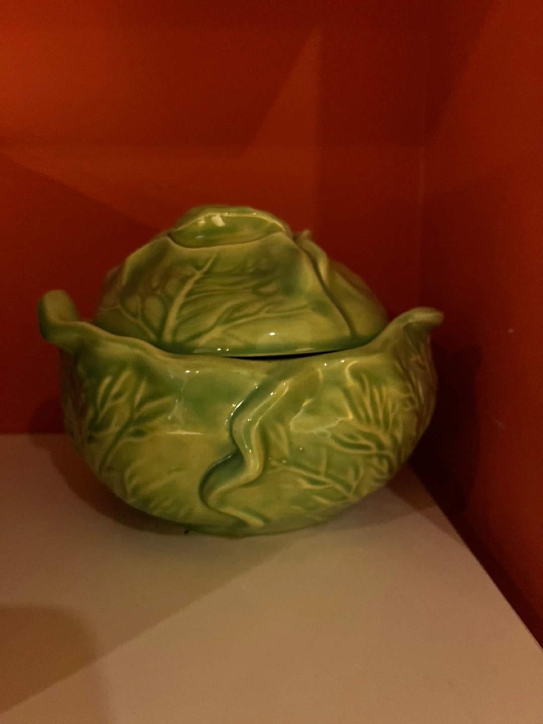 10Green ceramic bowl with a lid shaped like a cabbage. Could be used as a serving bowl or a decorative piece.