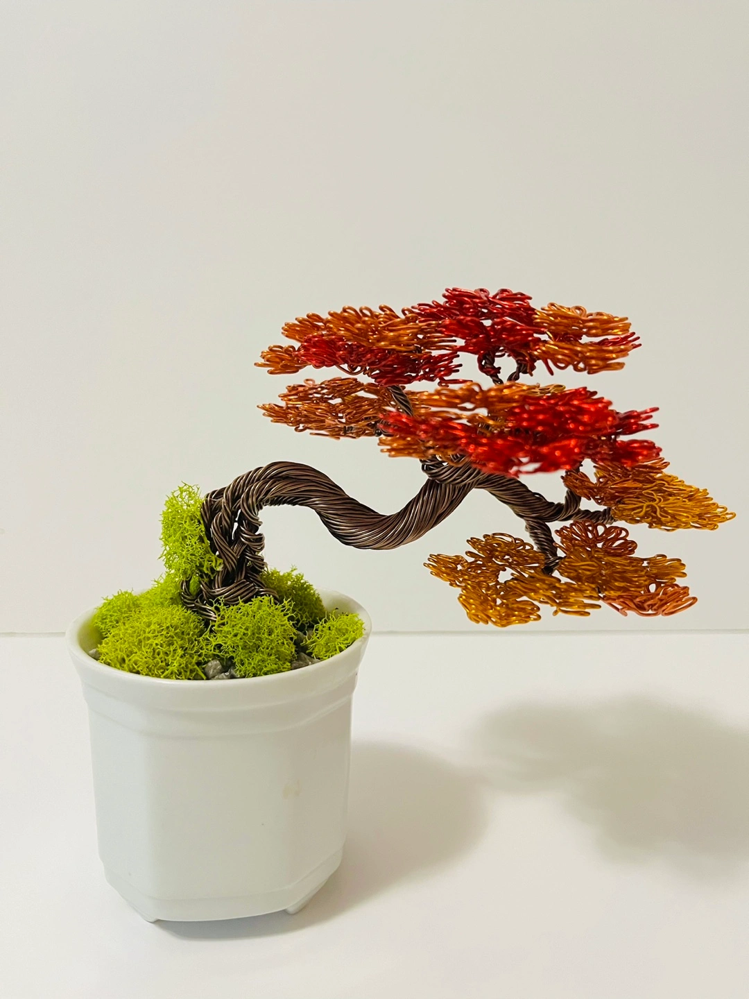 It was completely handmade by me and my wife, a unique piece crafted by us, Whether as a decoration in an apartment or office, whether in a showcase, on the shelf, on the desk or a side table, and also perfectly for birthday gifts, anniversary who loves bonsai, and flowers, it will always be an eye-catcher. Timeless, simple and yet special. A unique piece of art for your home. The tree is made of aluminum wires that sits on a ceramic pot with green moss, The trunk and branches are all intricately woven together. The tree is accented with red, orange and yellow leaves that give it a realistic look.