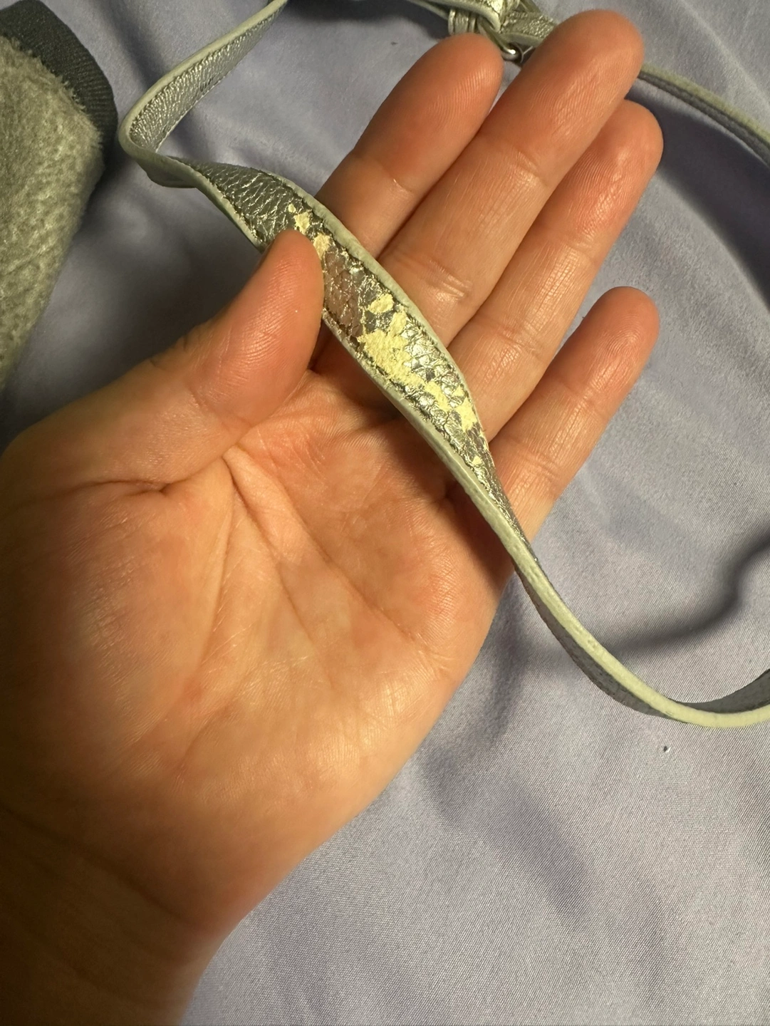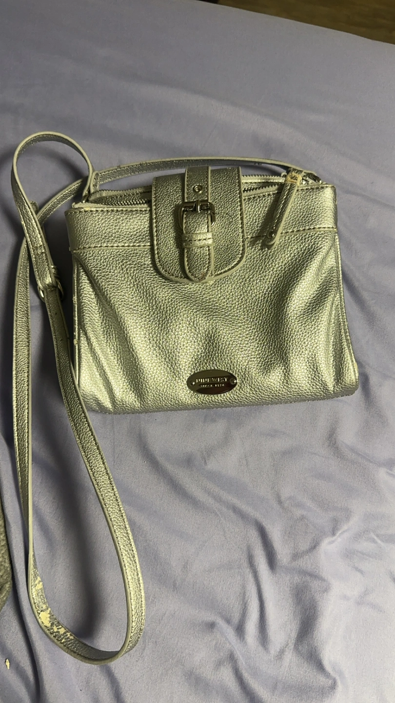 Silver crossbody bag with a buckle closure. Has a small zippered pocket on the front and a larger zippered compartment on the back.