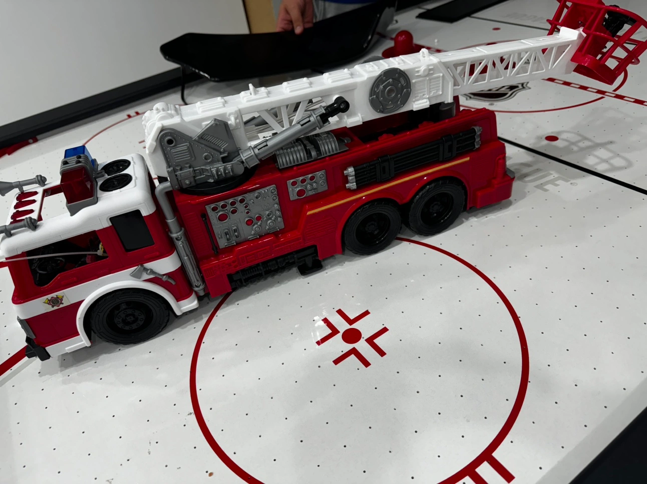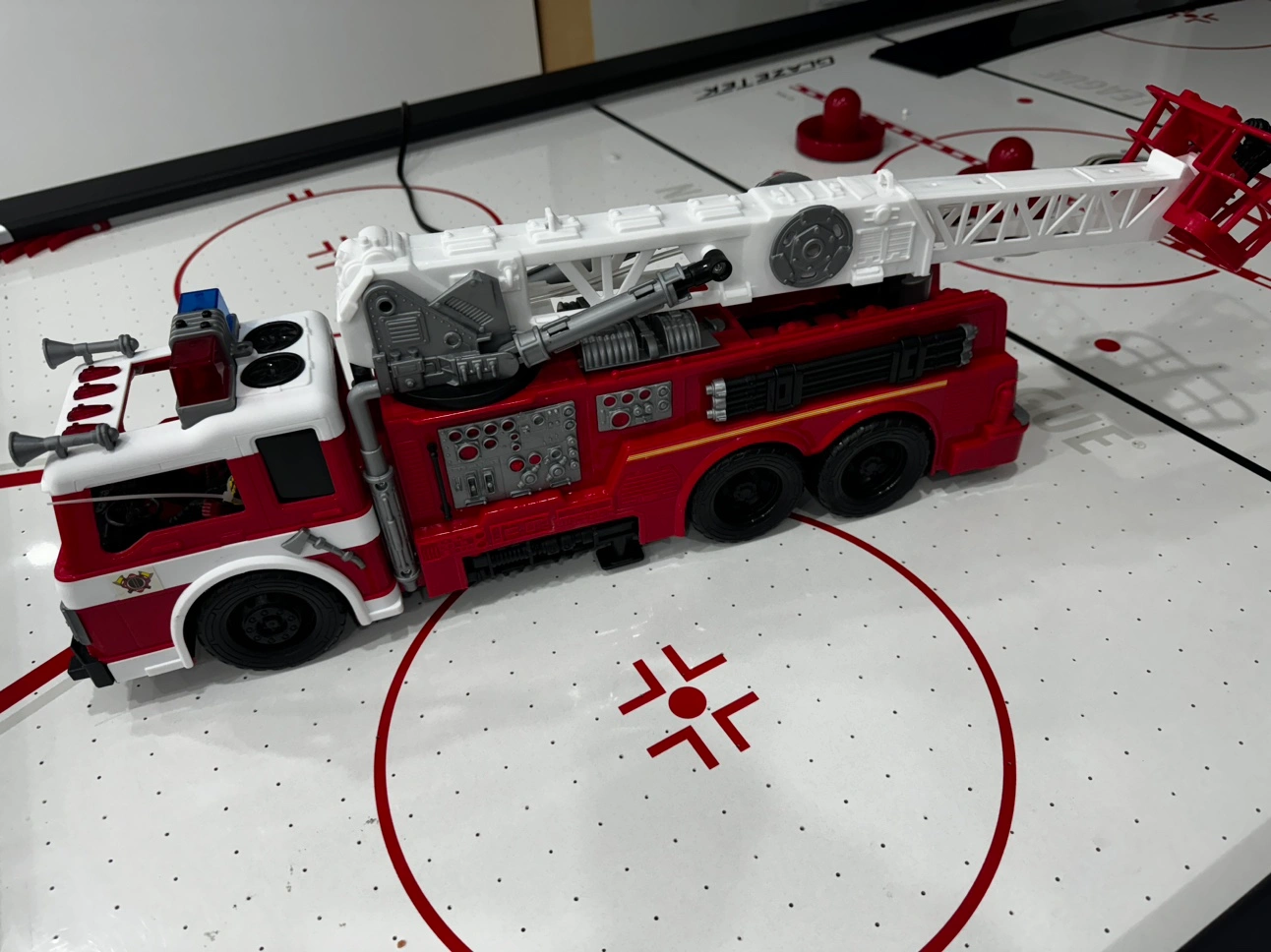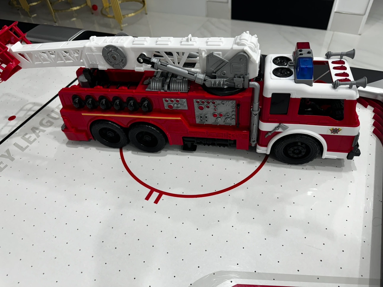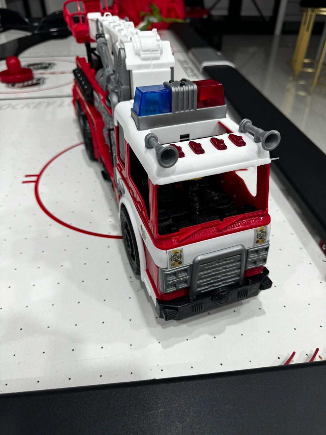 Red and white fire truck toy with a ladder that extends. Has lights and sounds. Also u can put water inside and use as water gun