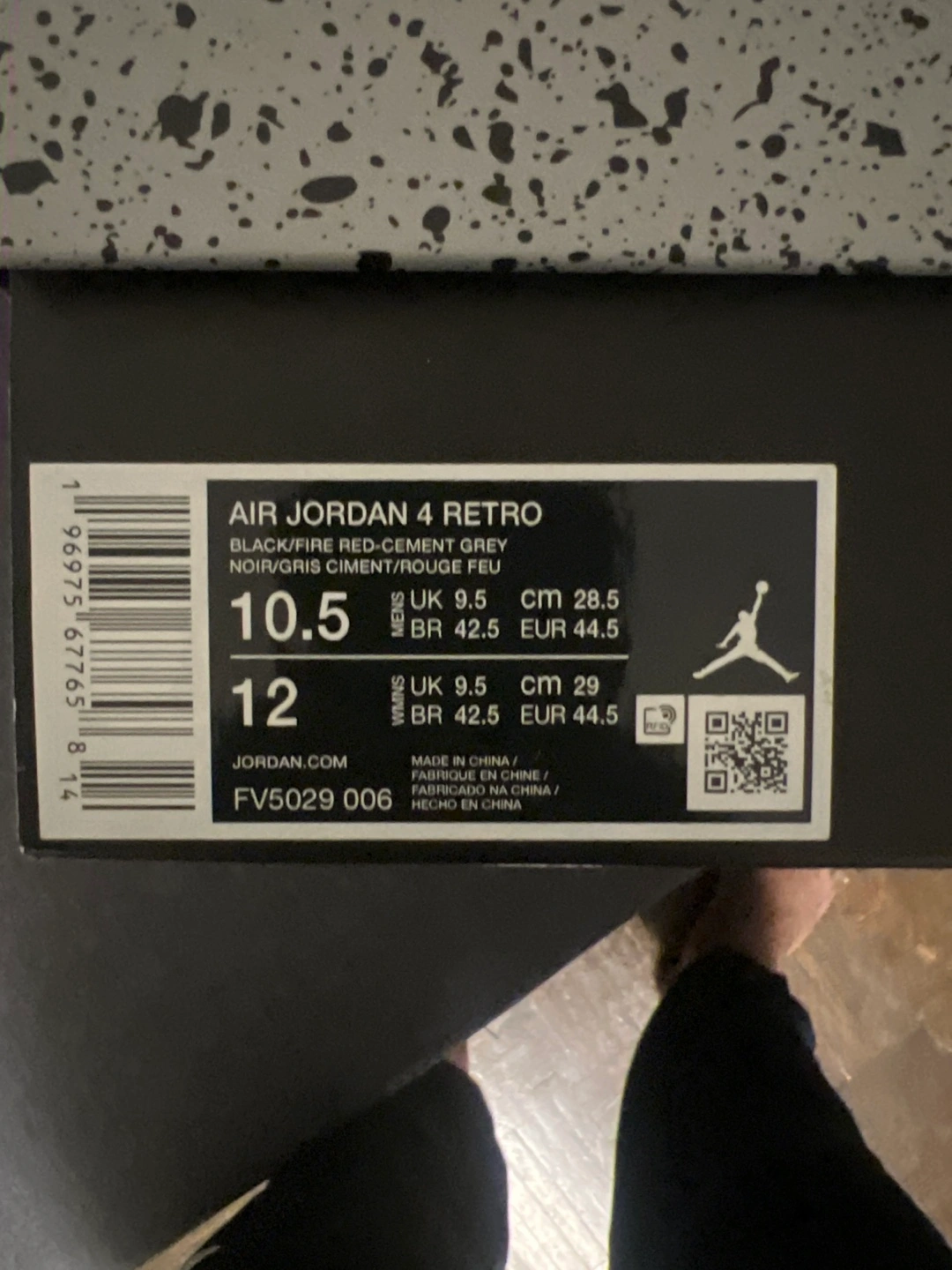 Buy & SellNew Air Jordan 4 Retro Black/Fire Red-Cement Grey size 10.5New Air Jordan 4 Retro Black/Fire Red-Cement Grey size 10.5$500Size 10.5 men's. Black, red, and grey colourway. Includes original box.ConditionNewSize10.5BrandJordan Brand 1 chats·0 favorites·35 viewsSELLERVaughnWest Queen West262 reviewsWHERE TO MEETCheck Location