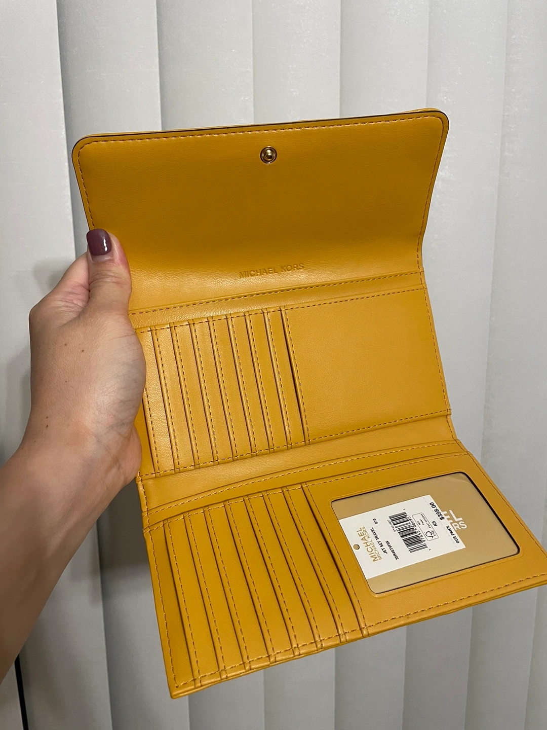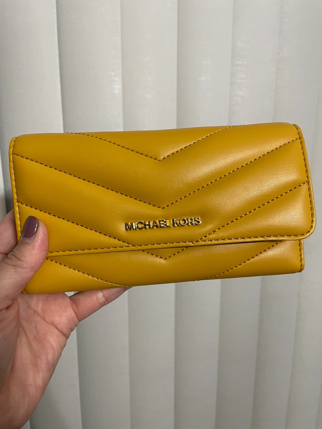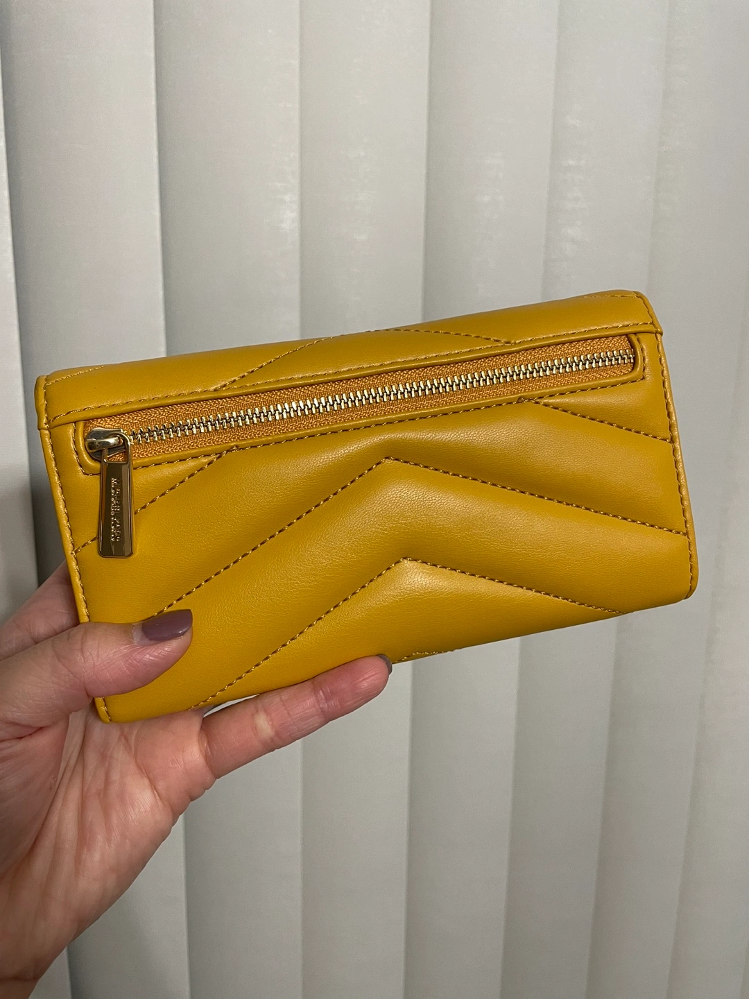 New. Mustard quilted wallet with gold accents. Zipper closure. Multiple card slots and a zippered coin pocket.