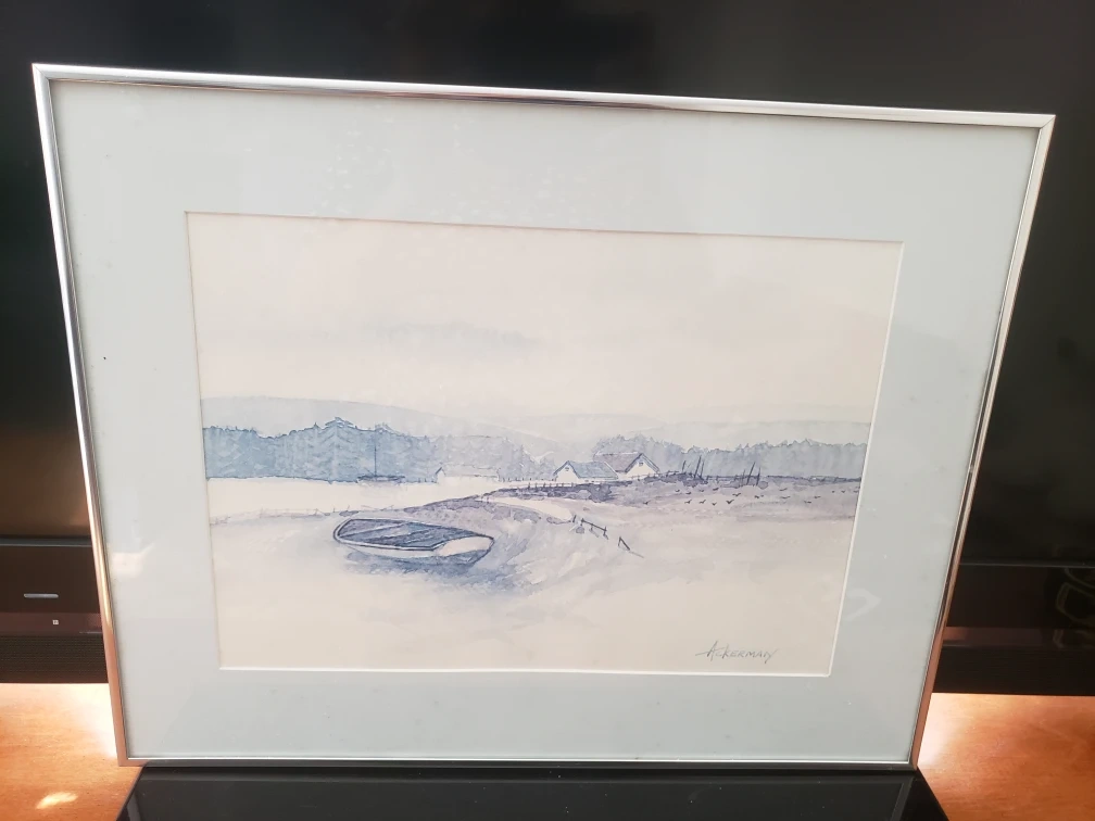 1000+Framed watercolour painting of a lakeside scene. Signed by Kearney. A product of 'Distinctive Graphics' Toronto, Canada. small spots but not very noticeable unless you're looking for them