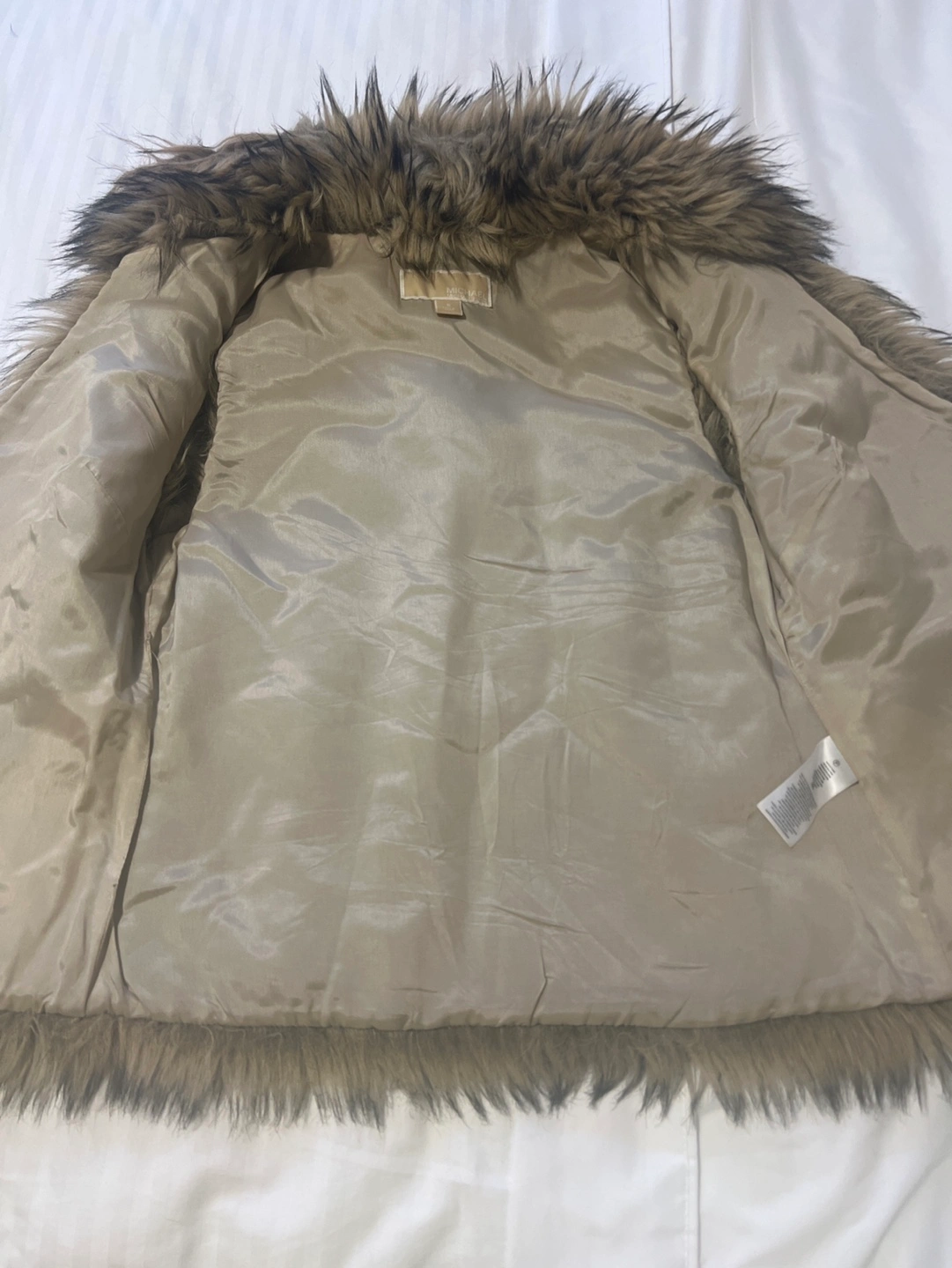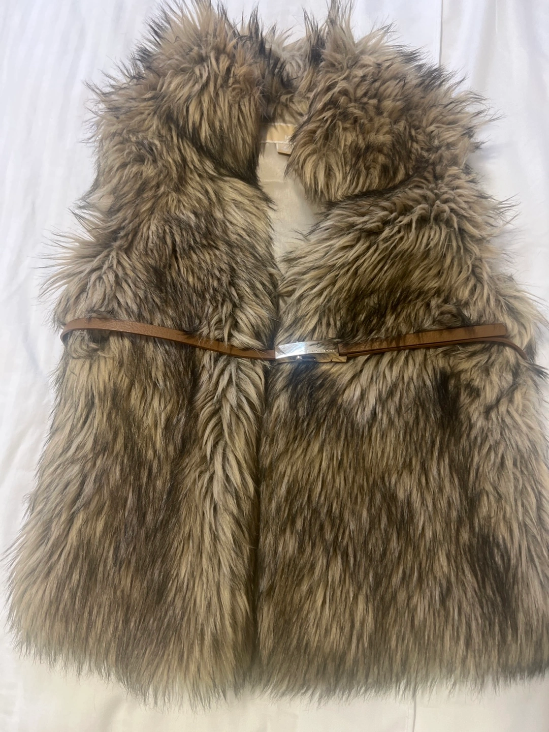 96Size small. Faux fur vest with a belt. Brown and beige colour.
