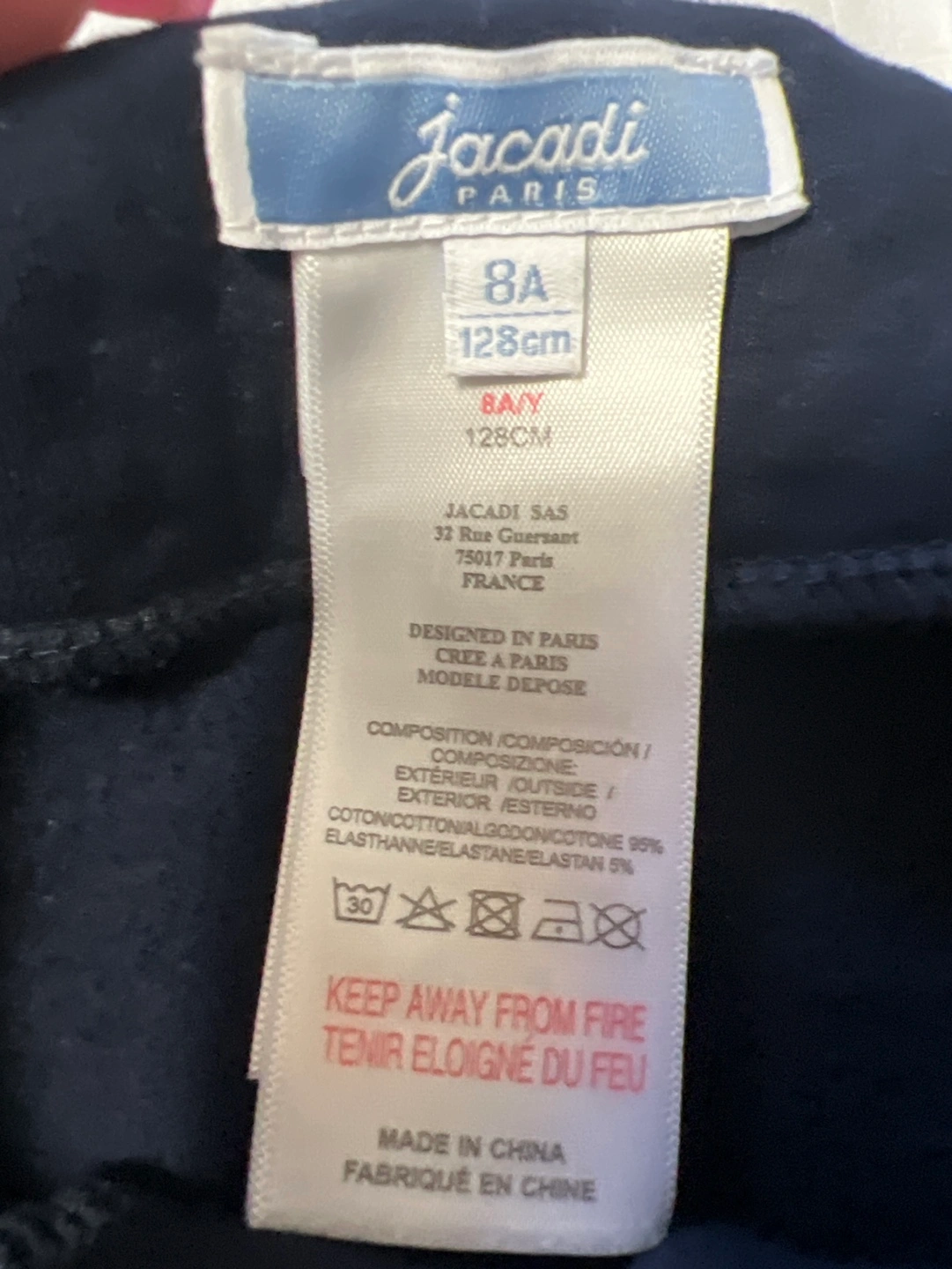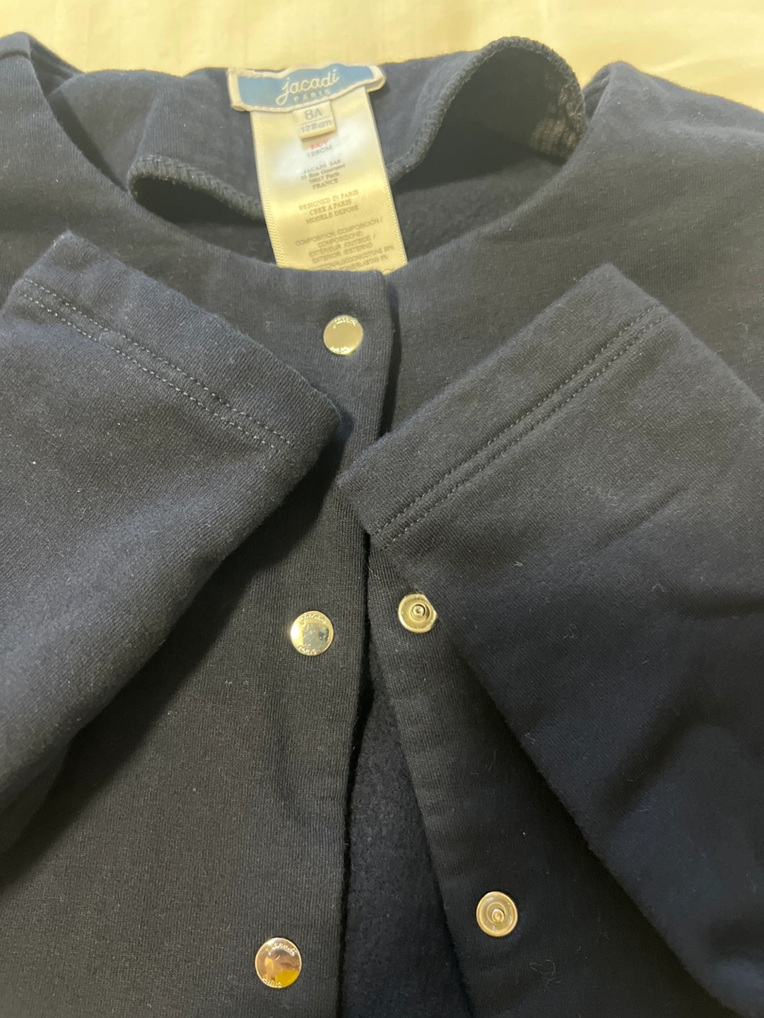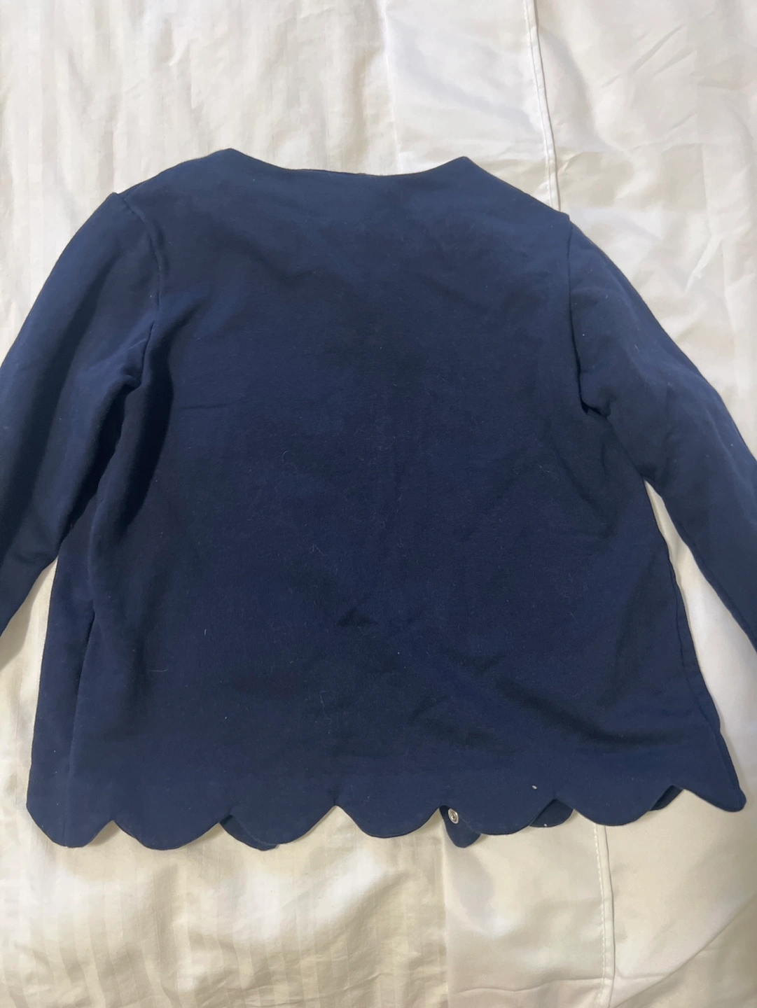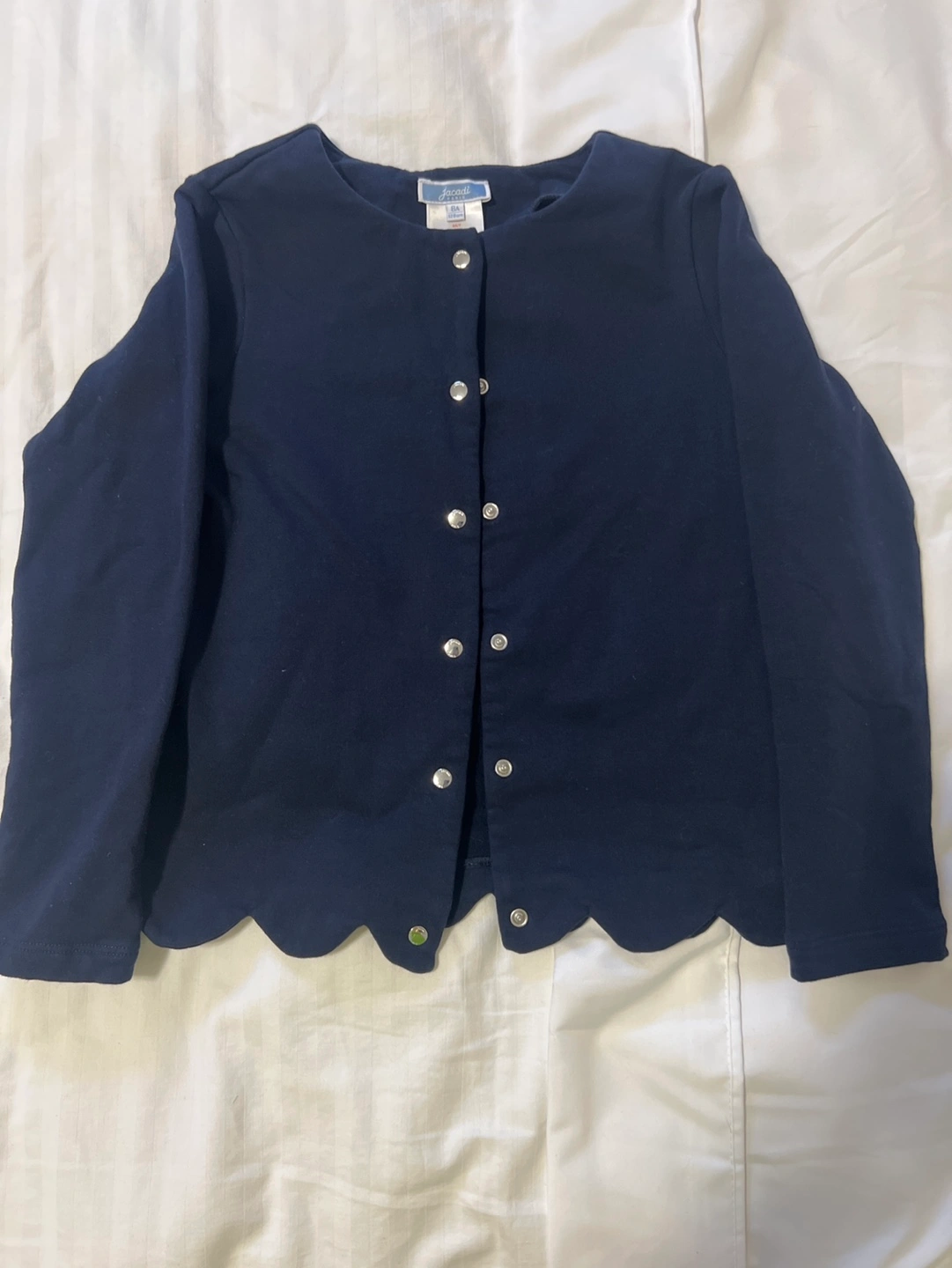 96Long-sleeved navy blue cardigan. Scalloped hemline and silver buttons. Size 8A.