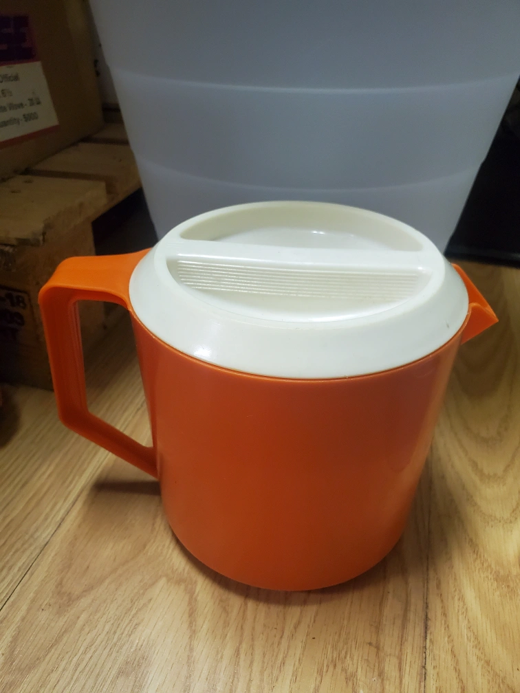 MCM Vintage Rubbermaid Plastic PITCHER 1.5 Quart Orange LID for use the Kitchen or on a picnic or to display.