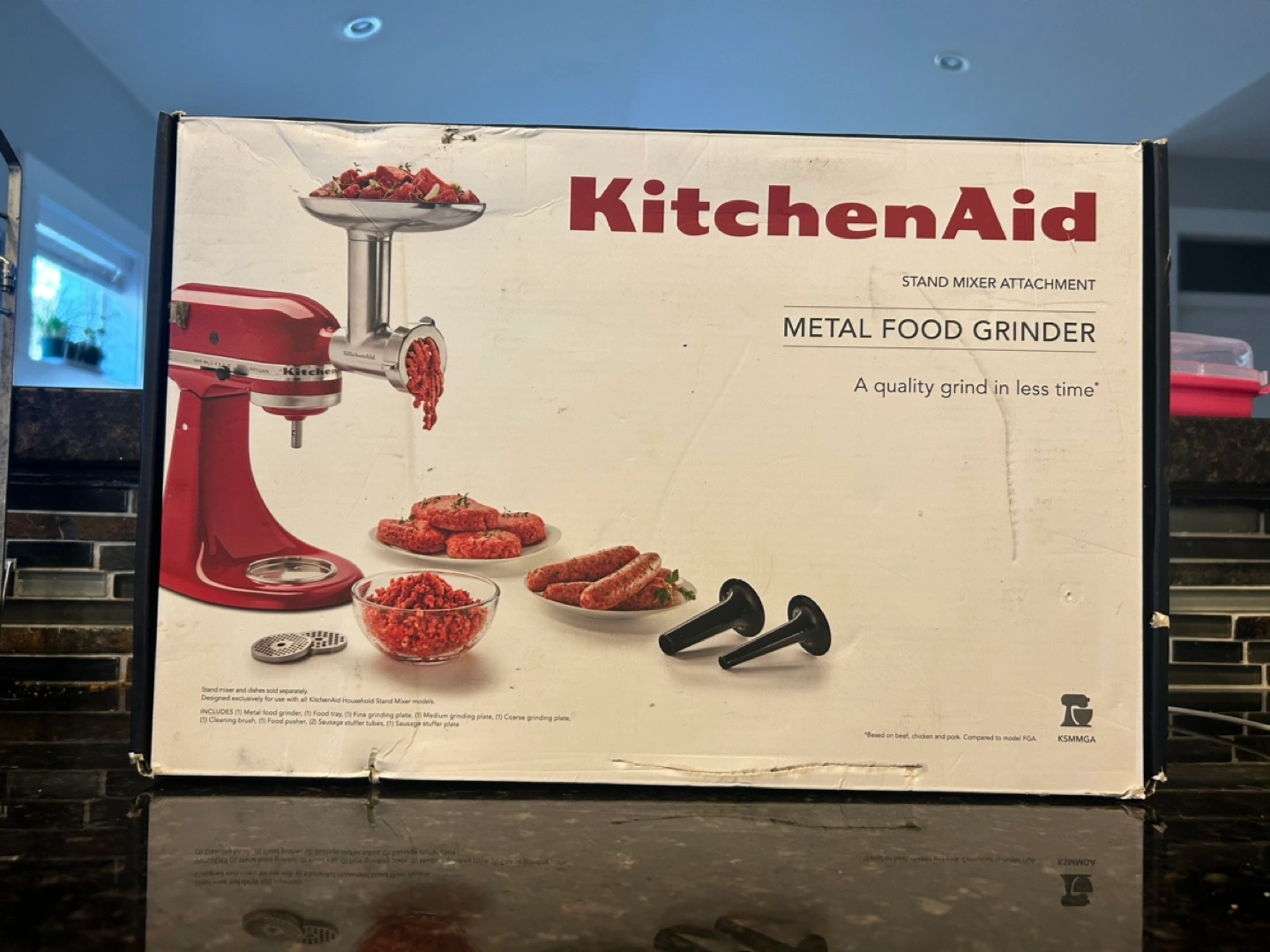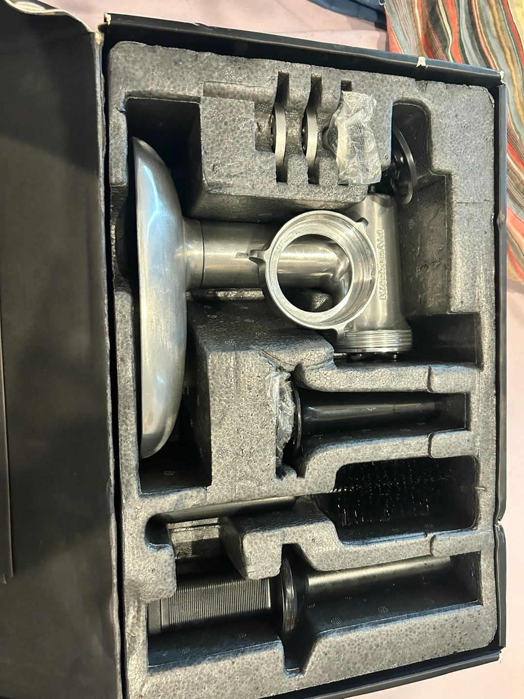 Stand mixer attachment, includes food tray, grinding plates, cleaning brush, food pusher and sausage stuffer tubes. Brand new, never used. Box has a bit of damage from being in storage.