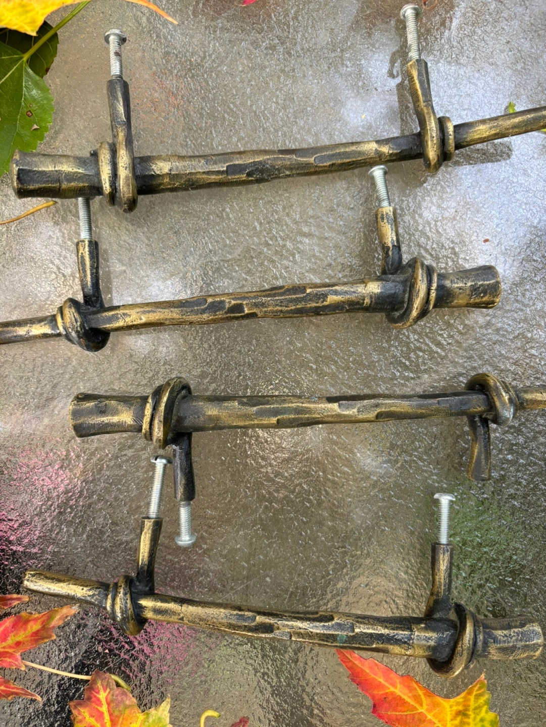 Set of four cabinet knobs with a knotted design and an antique finish. The knobs are approximately 3.5 inches long and 1.25 inches wide.