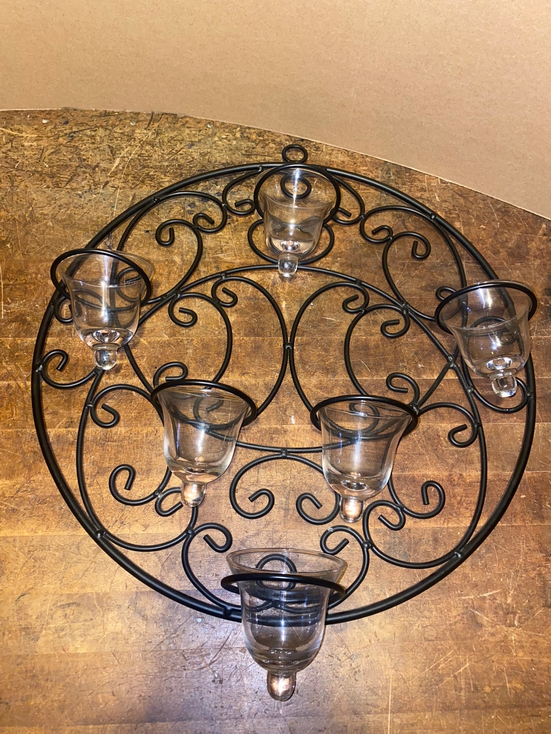 Round metal candle holder with five glass candle holders. Perfect for tea lights or small votive candles. Can also hold small plants.