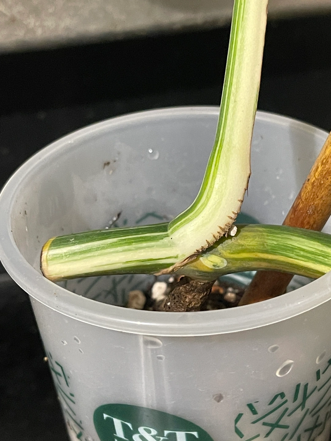 Healthy cutting with activating node. Currently rooting in tree fern (long air root).