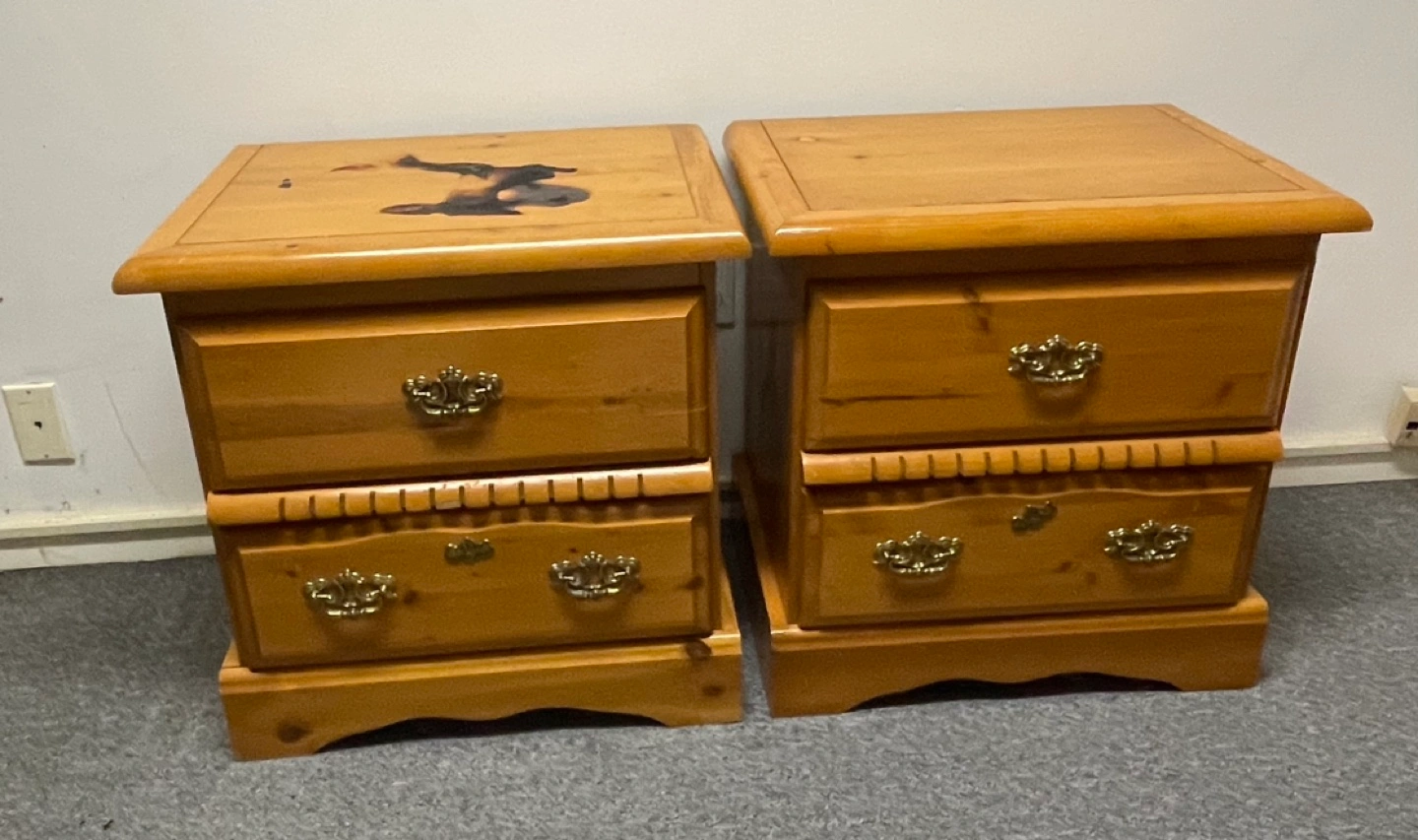 Two vintage nightstands with two drawers each. Made of all wood with gold-coloured hardware.