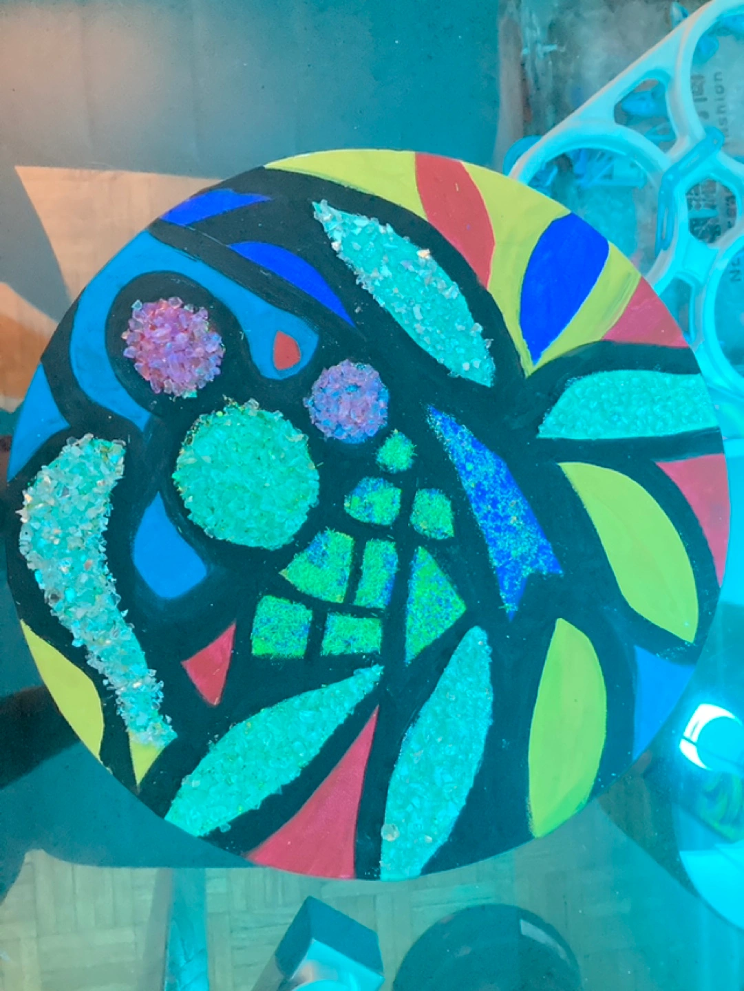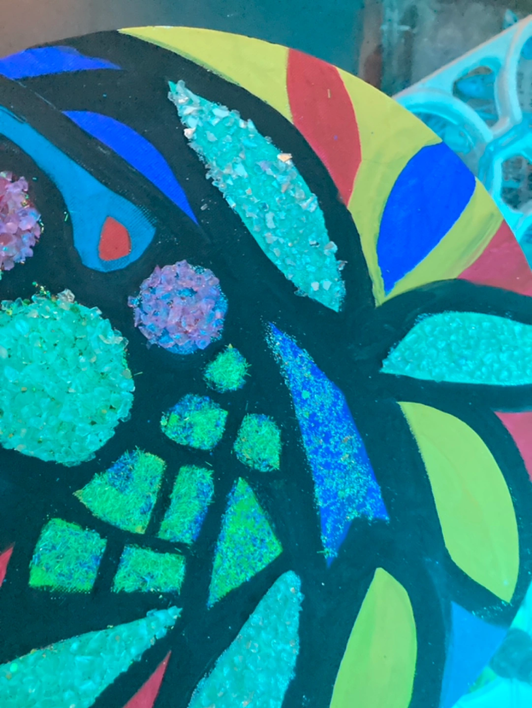 Unique round painting with hand-painted design and mosaic accents. Green, blue, and red colours with black accents. Additional details are the sparkling shards and glittered areas that makes this a masterpiece. Perfect for any space or as a gift.