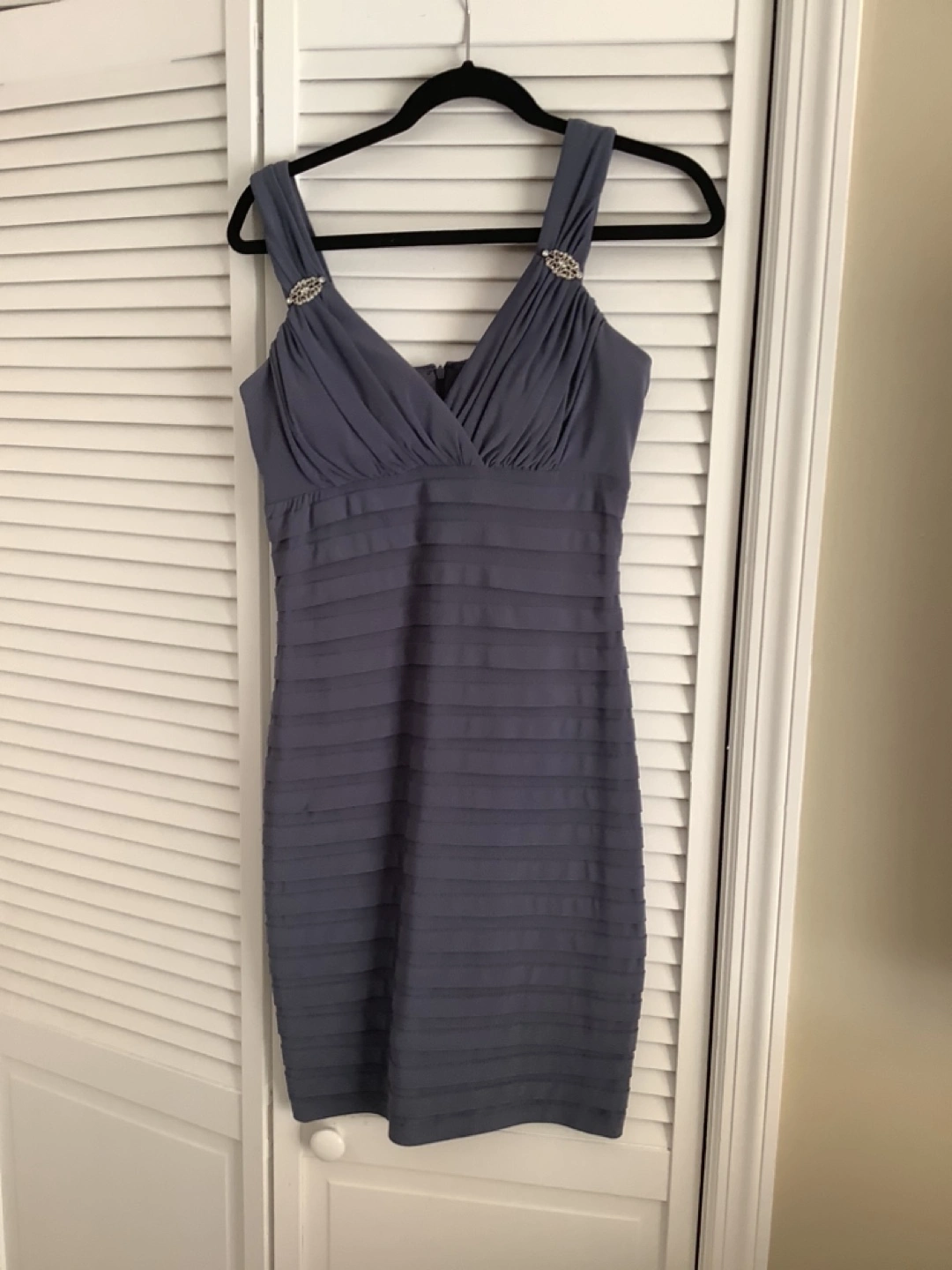 Gray, sleeveless, dress with a v-neck. It has a ruched bodice, back zipper closure, and a fitted silhouette. Like new