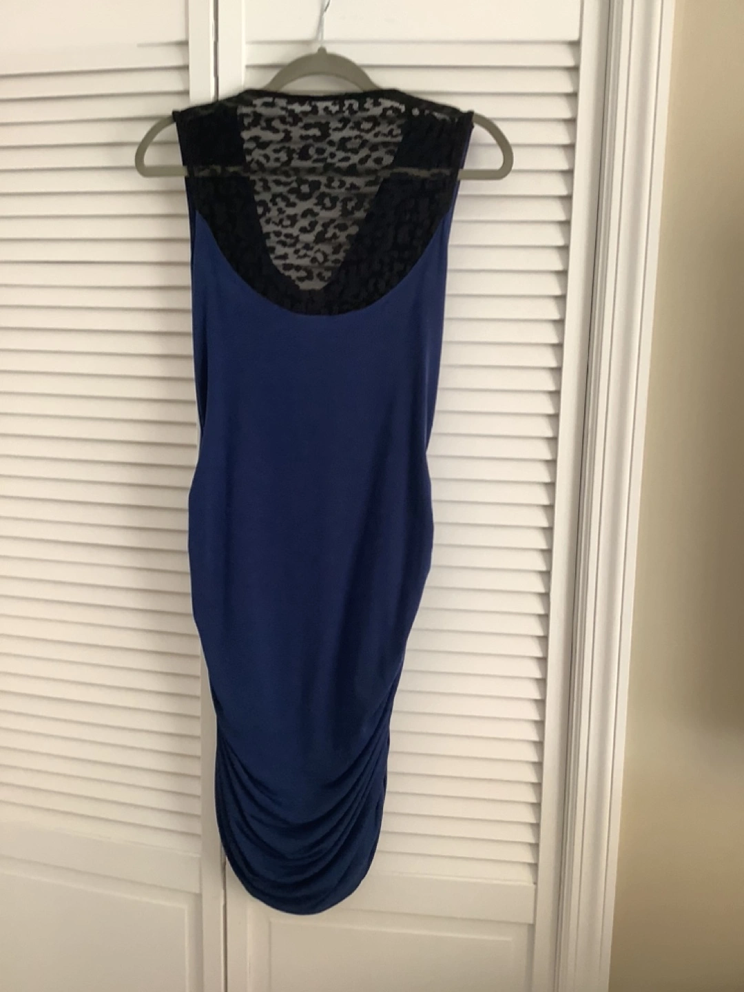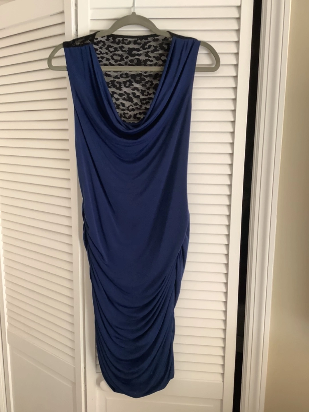 Sleeveless, navy blue, fitted dress. Features a black lace and leopard print overlay on the back. Like new. Runs small.