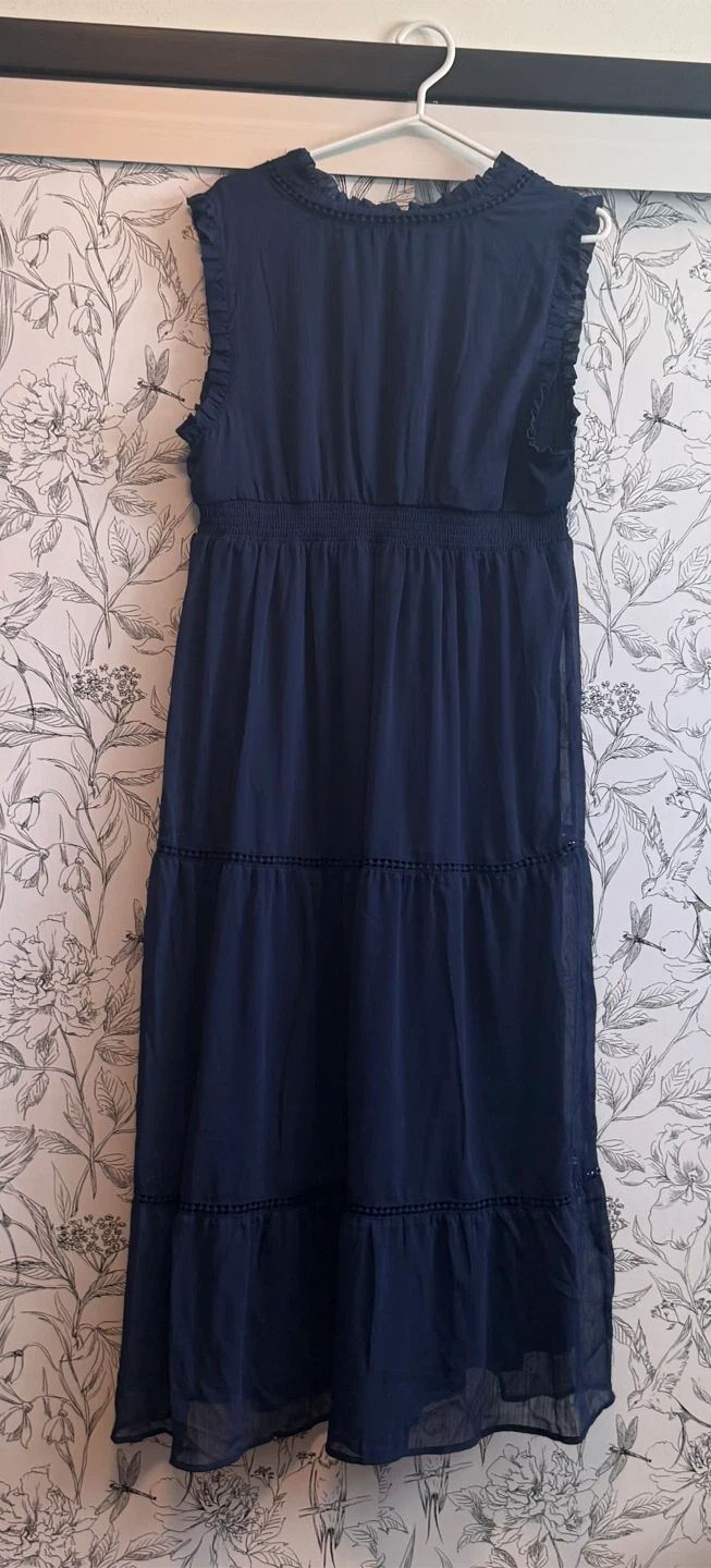 Cristina B navy blue maxi dress. It's a tiered style with a smocked waist. Size is L. Material is lightweight.