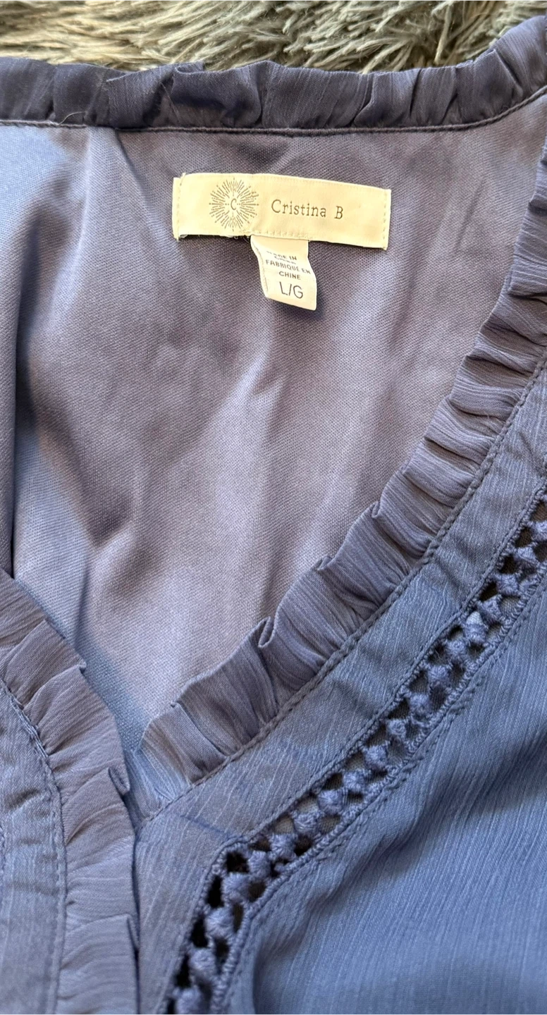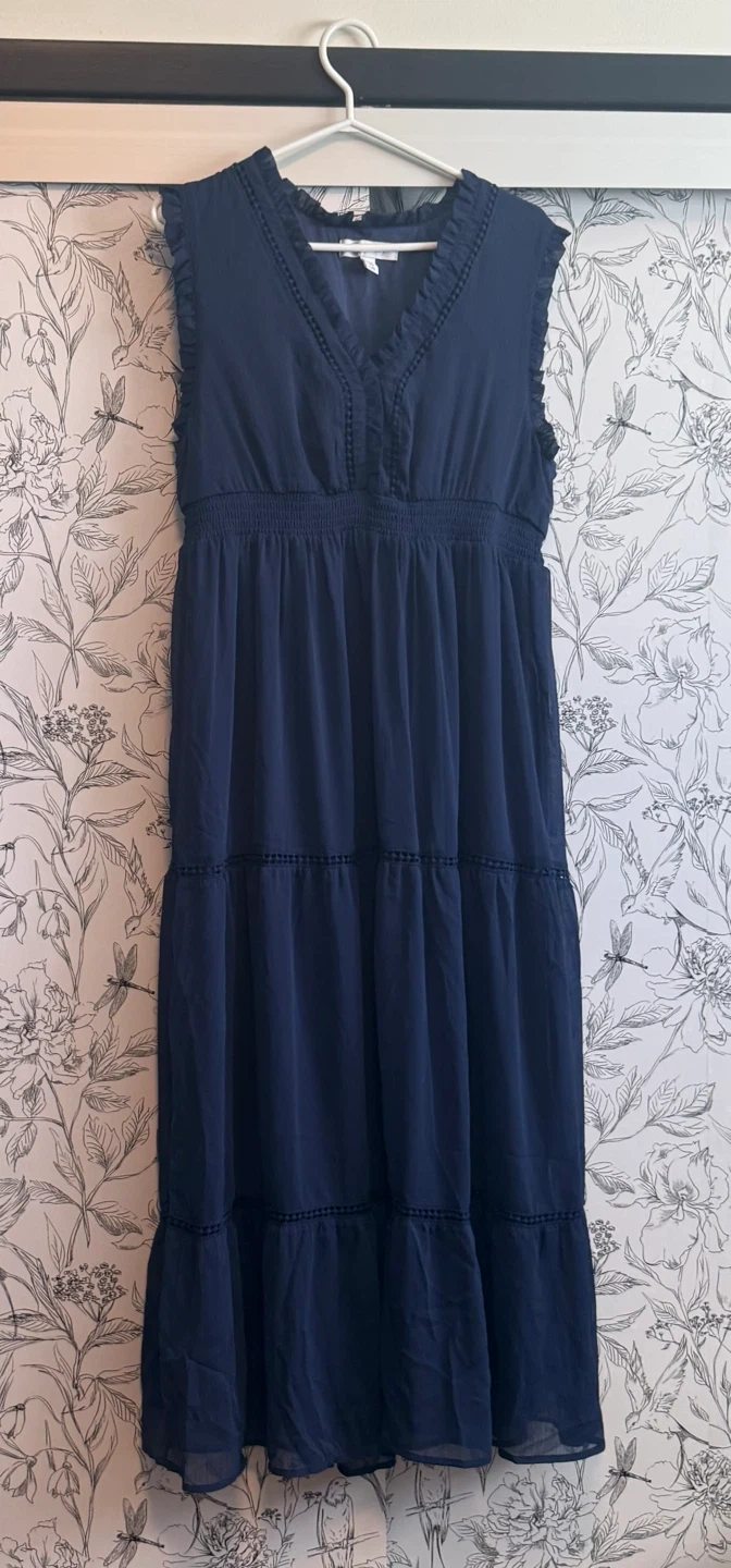 Cristina B navy blue maxi dress. It's a tiered style with a smocked waist. Size is L. Material is lightweight.