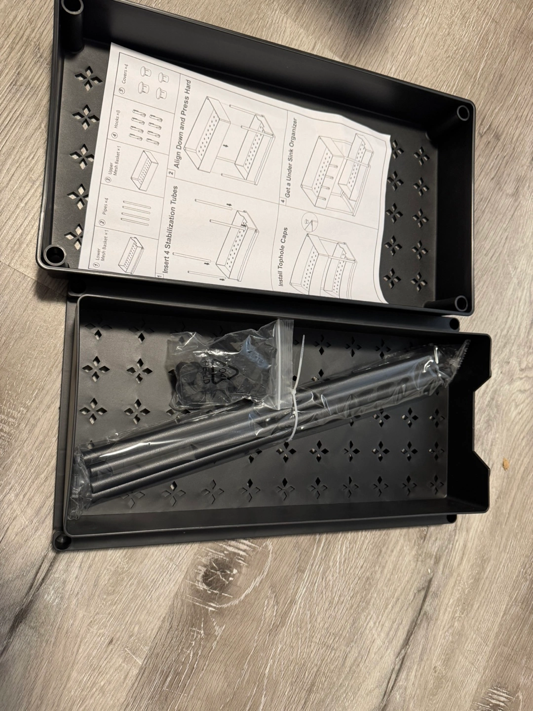 Black two-tier shelf organizer for your kitchen. Made of metal and plastic. Includes instructions. Easy assembly. Pick up at Eglinton Ave West & Oakwood Ave