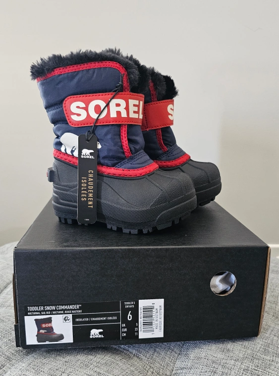 153New/unused Sorel Snow Commander boots. Blue and red with a faux fur lining. Size 6. Original price $80 + gst Pickup in Midtown SW, Airdrie