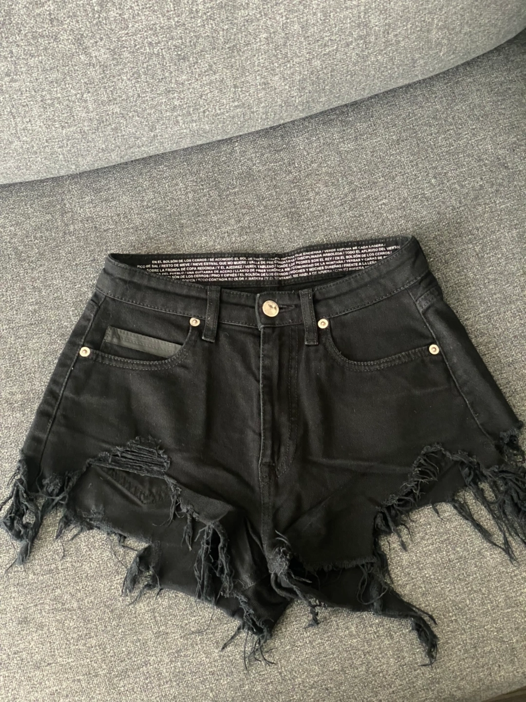 High waisted denim shorts with an embroidered eagle on the back. Distressed and frayed hem. Size small.