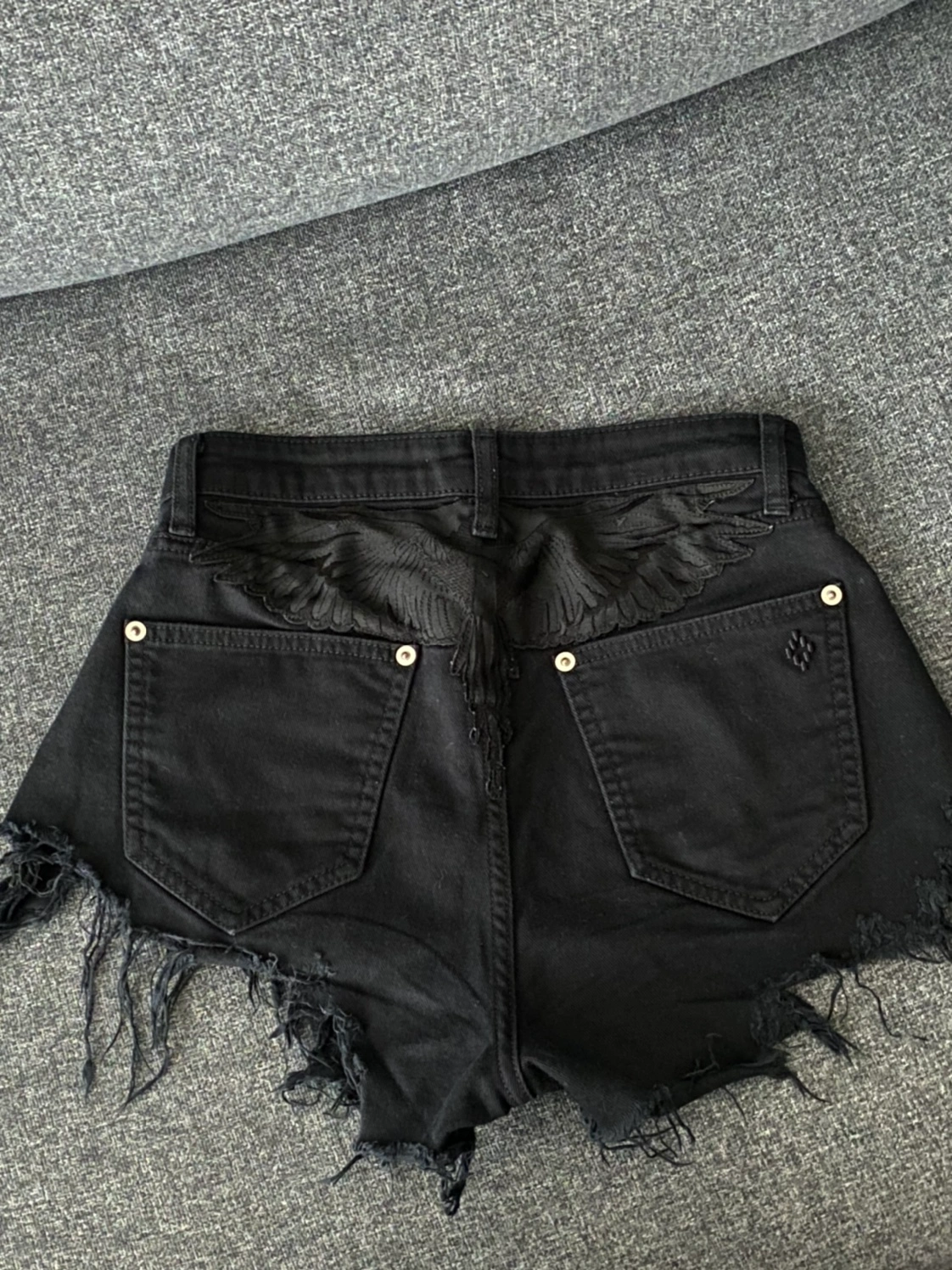 High waisted denim shorts with an embroidered eagle on the back. Distressed and frayed hem. Size small.