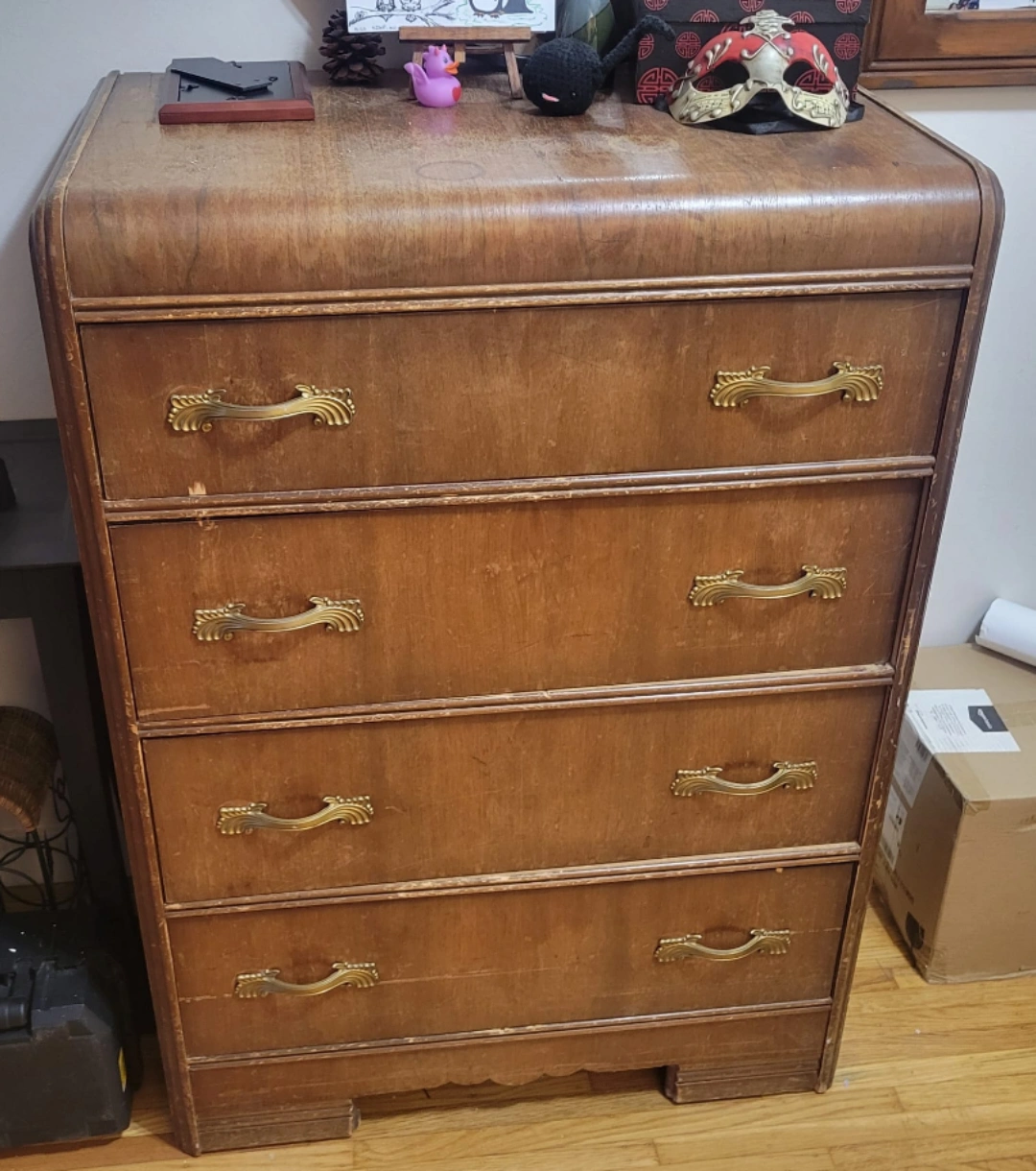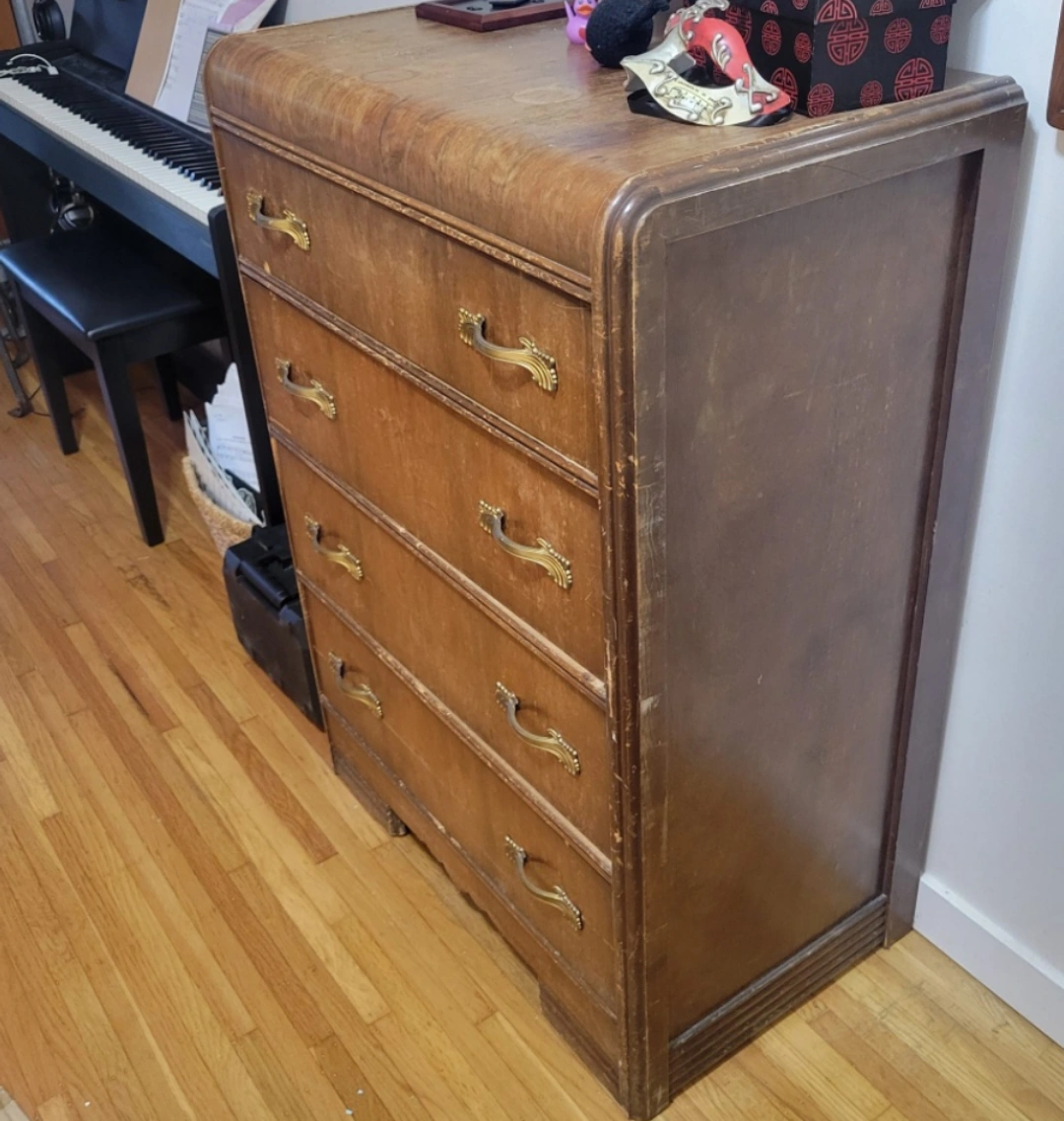 Four-drawer chest of drawers. Wood construction with ornate gold-toned handles. Some signs of wear and tear. Was going to restain the wood but decided not to take it with me since I'm moving into a smaller roomed space with lots of cupboard room! It's a lovely piece though for any other antique lovers out there!