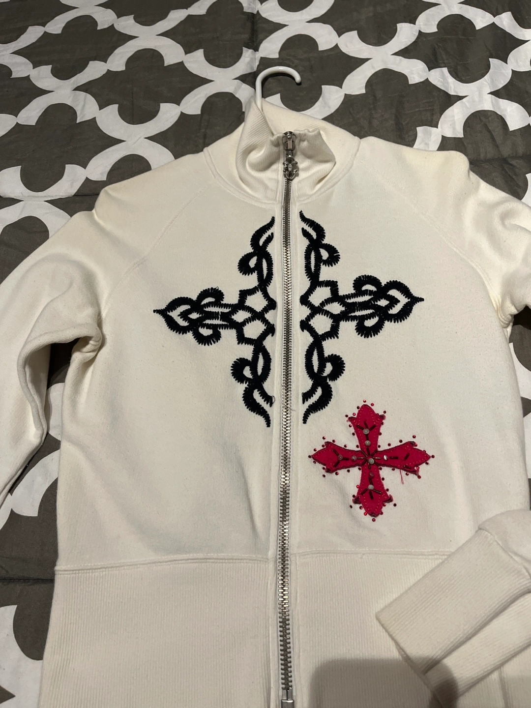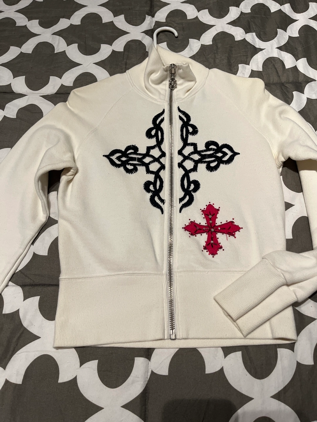 White zip up jacket with black embroidery and a Nine Lives design on the back.