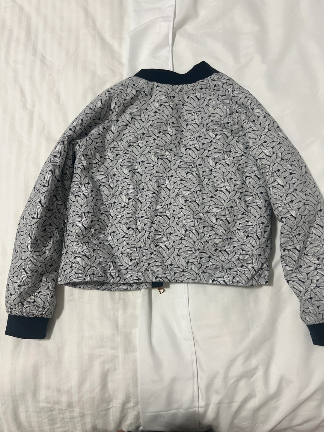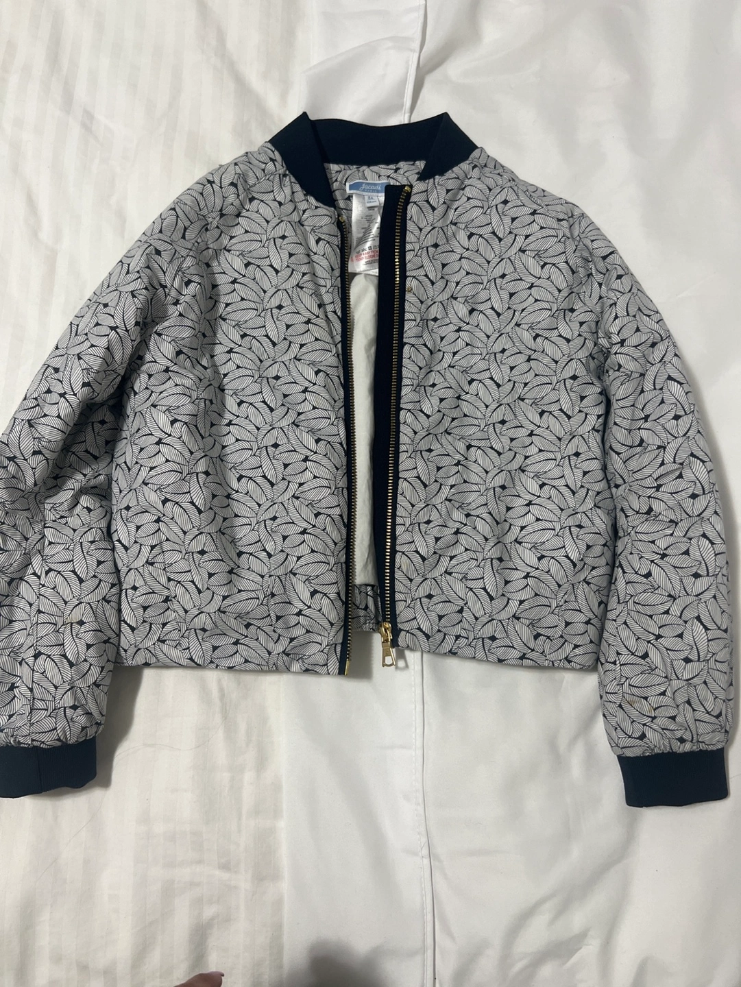 96Black and white leaf pattern bomber jacket. Gold zipper. Size 8A (128 cm).