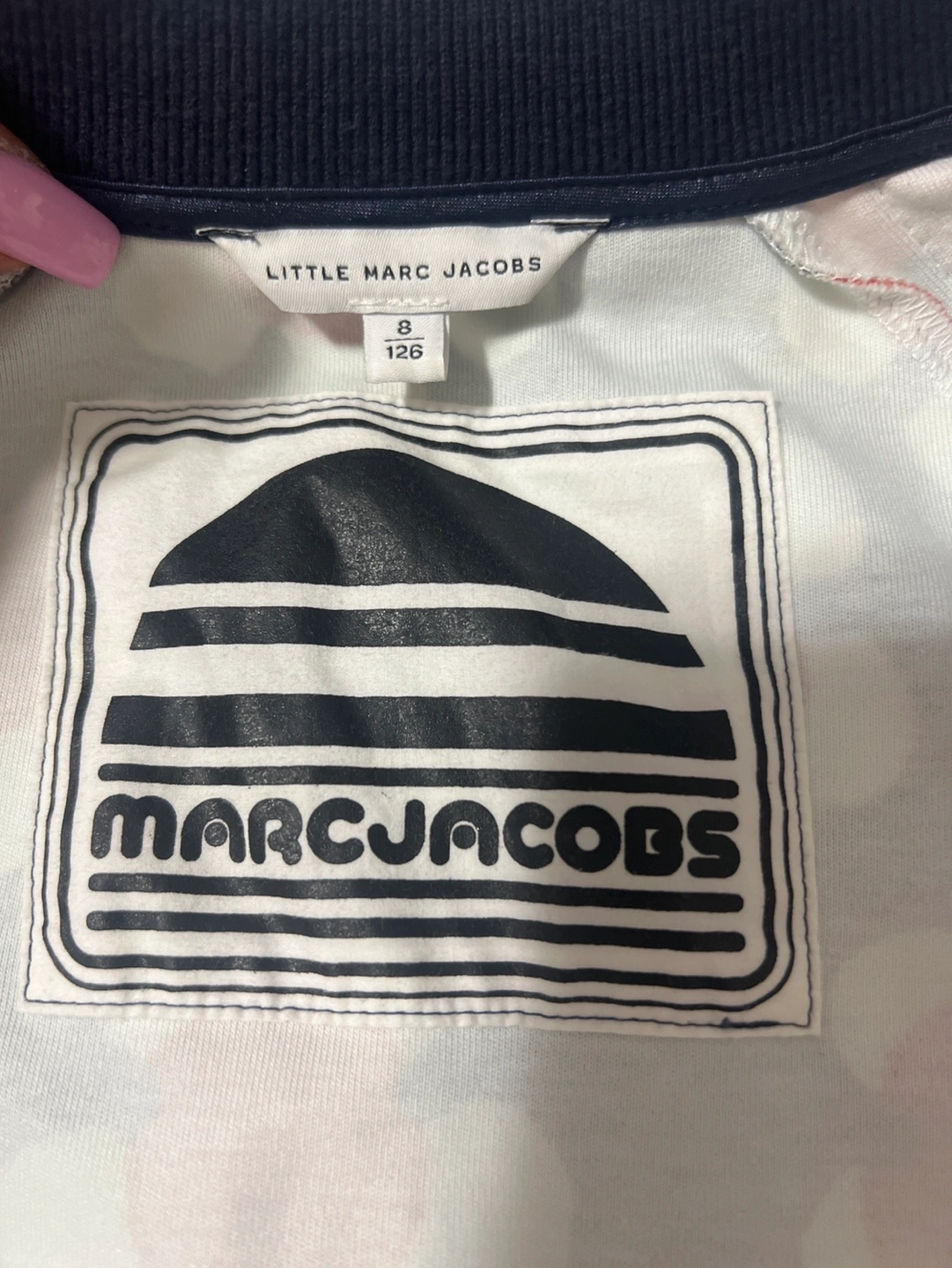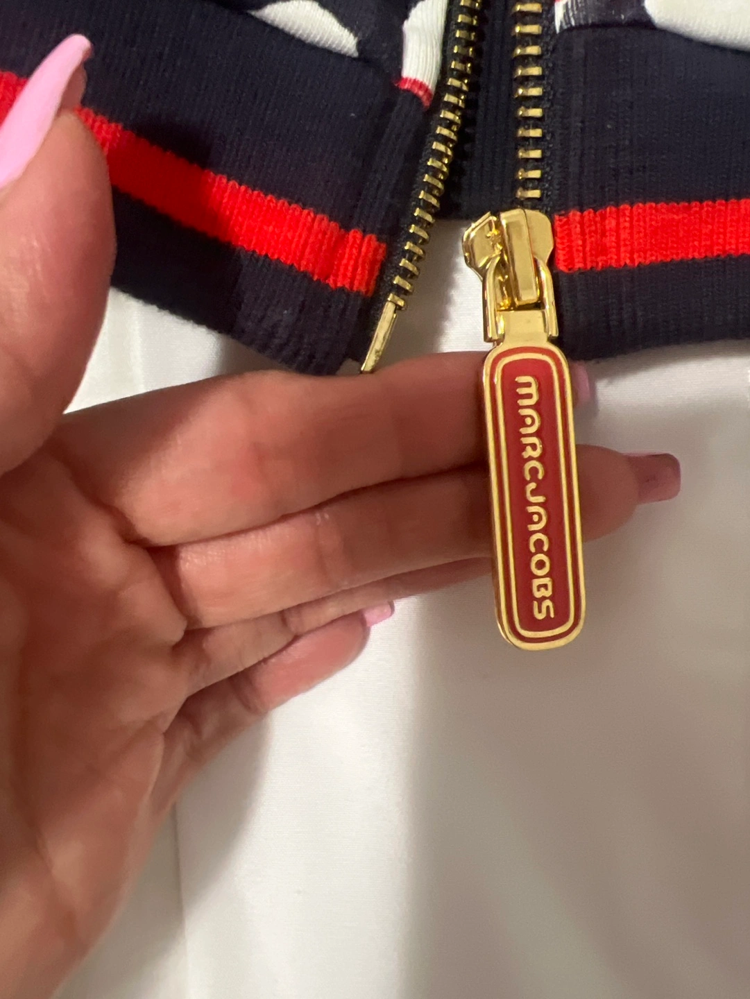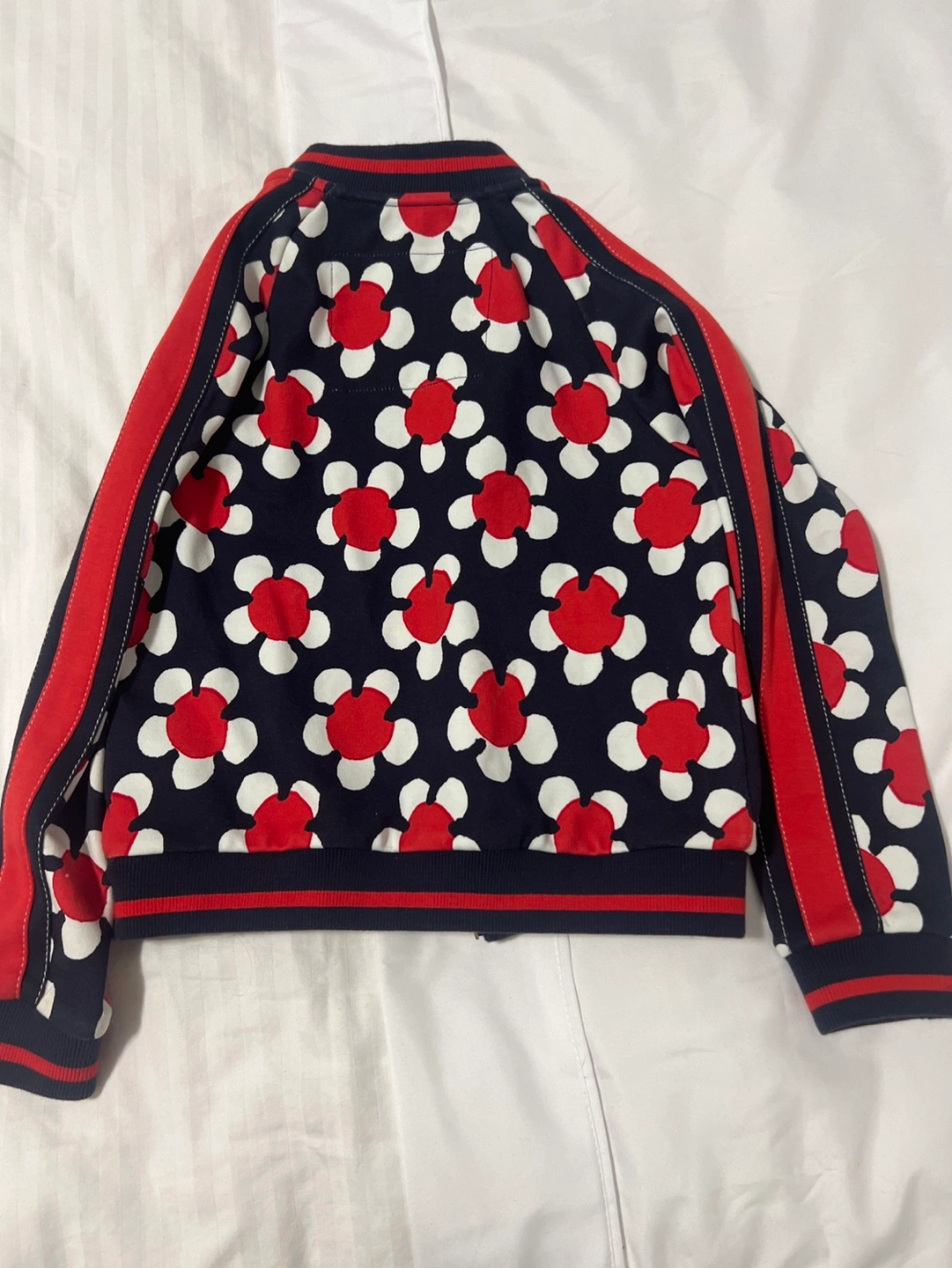 96Black bomber jacket with red and white floral print, red and white stripes on sleeves, and gold zipper. Size 8 (126 cm).
