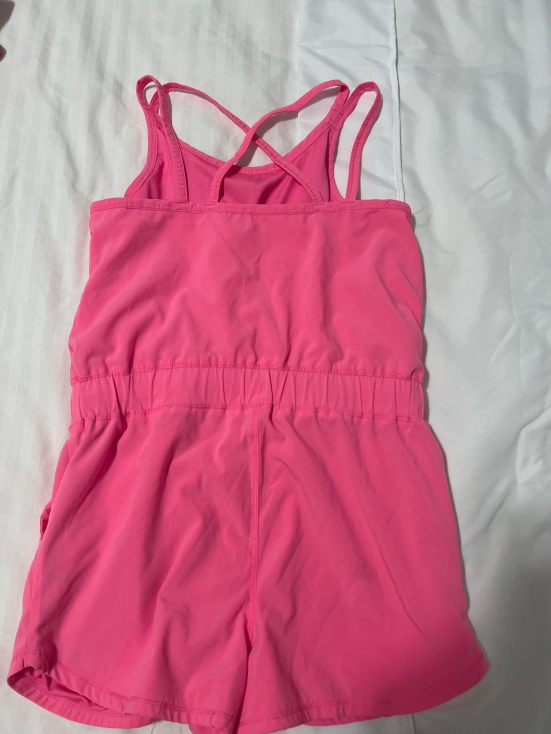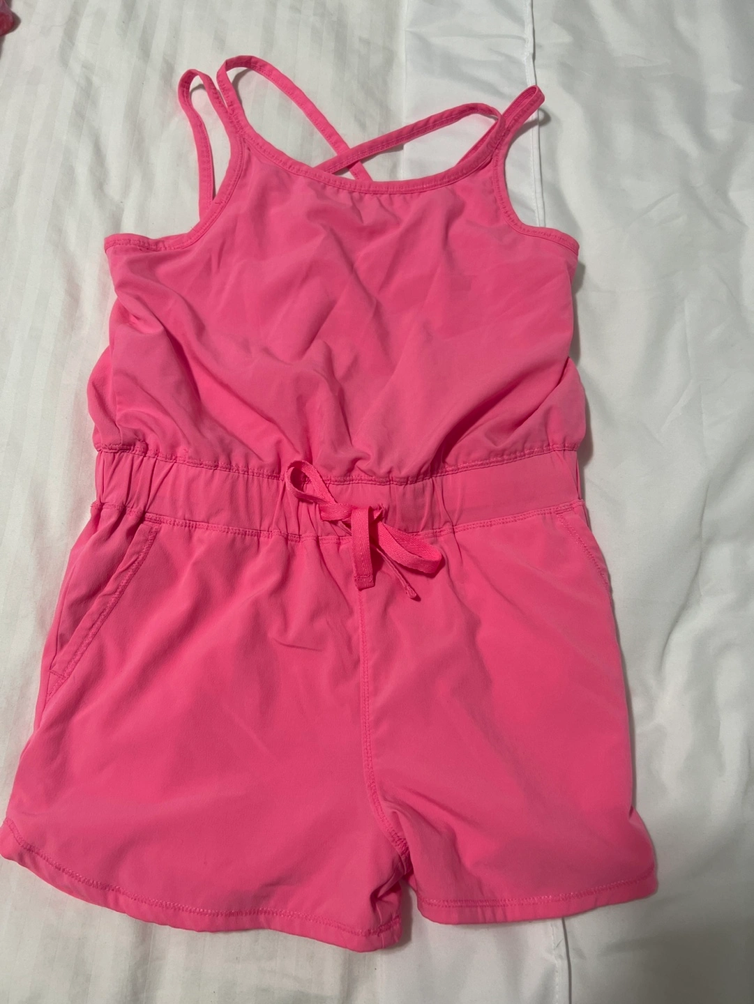 96Pink romper with adjustable straps and a drawstring waist. Two pockets on the sides.