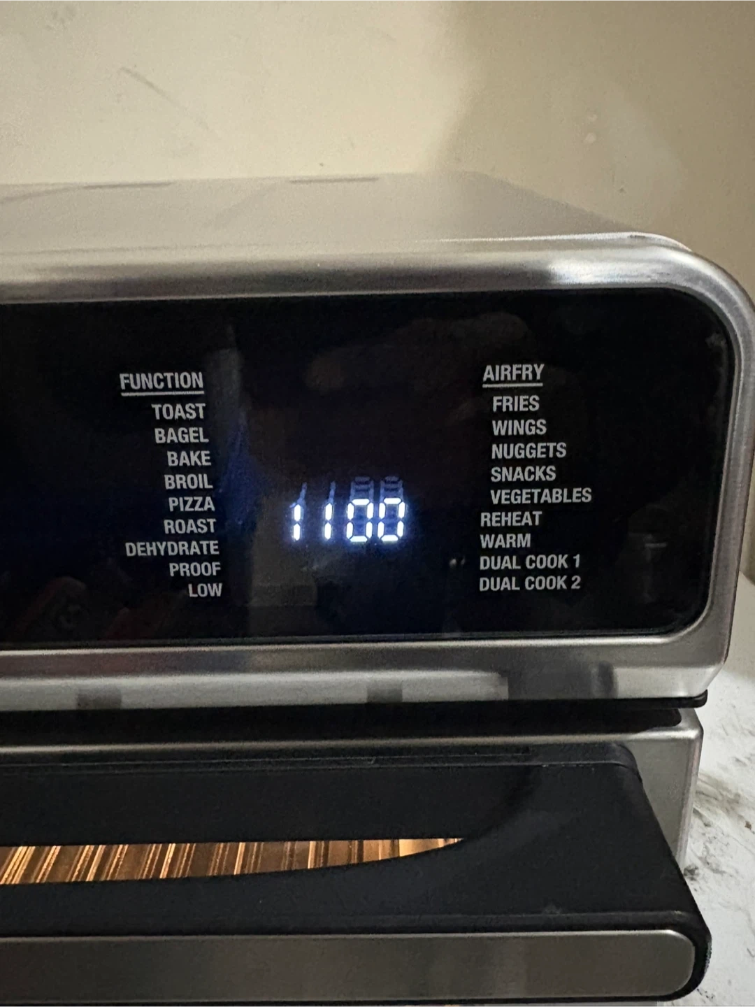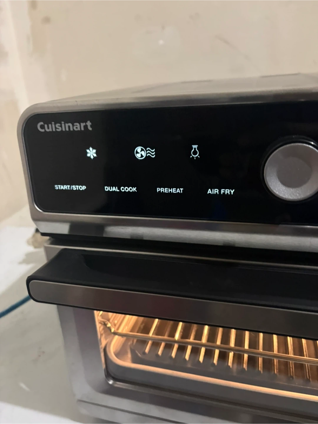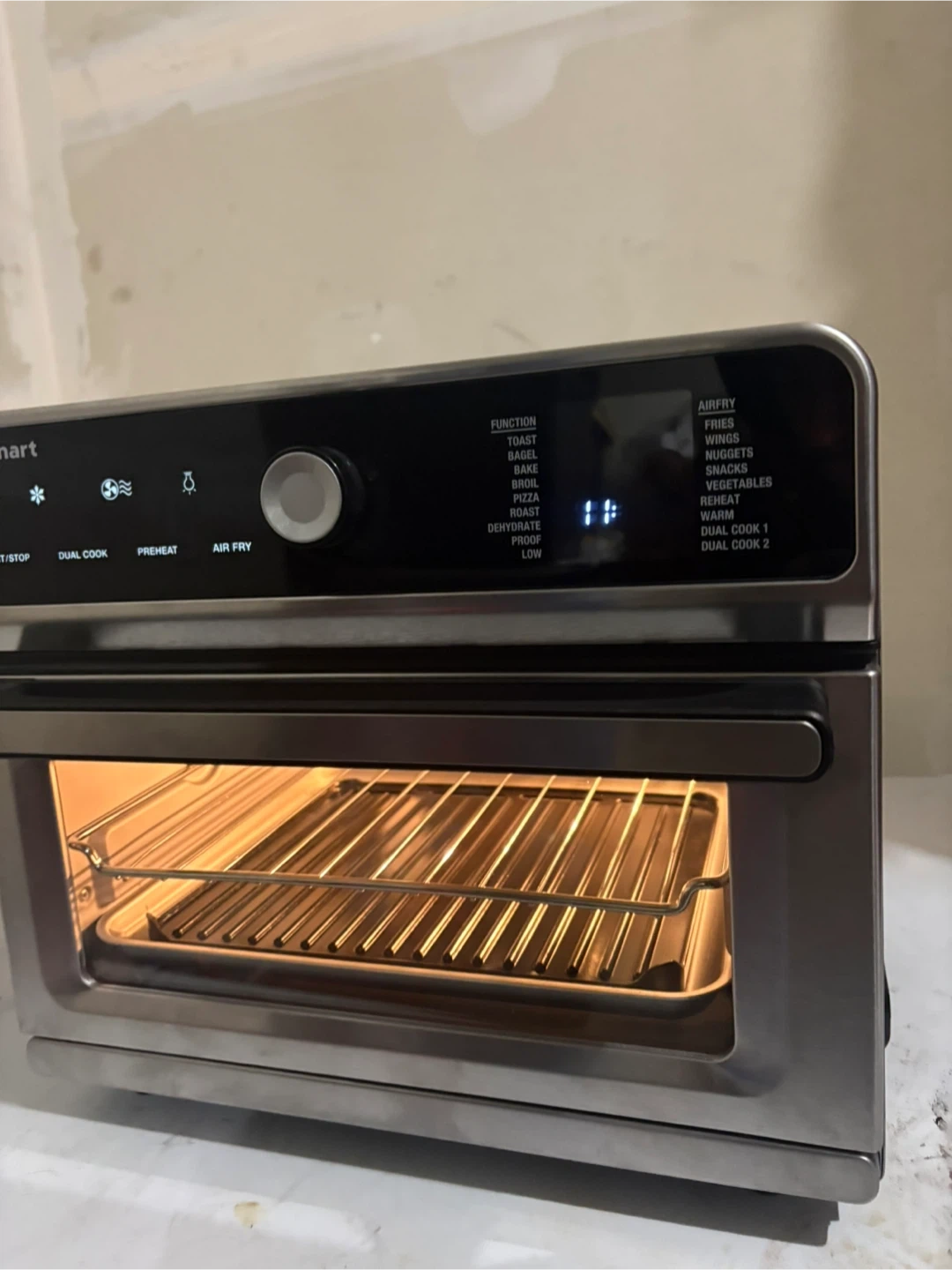 This Cuisinart oven offers multiple functions including toast, bake, broil, pizza, dehydrate, proof, low, and air fry options like fries, wings, nuggets, snacks, and vegetables. It also has dual cook settings. Functions include start/stop, dual cook, preheat, and air fry.