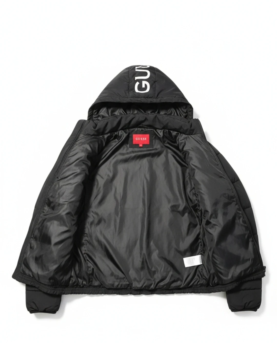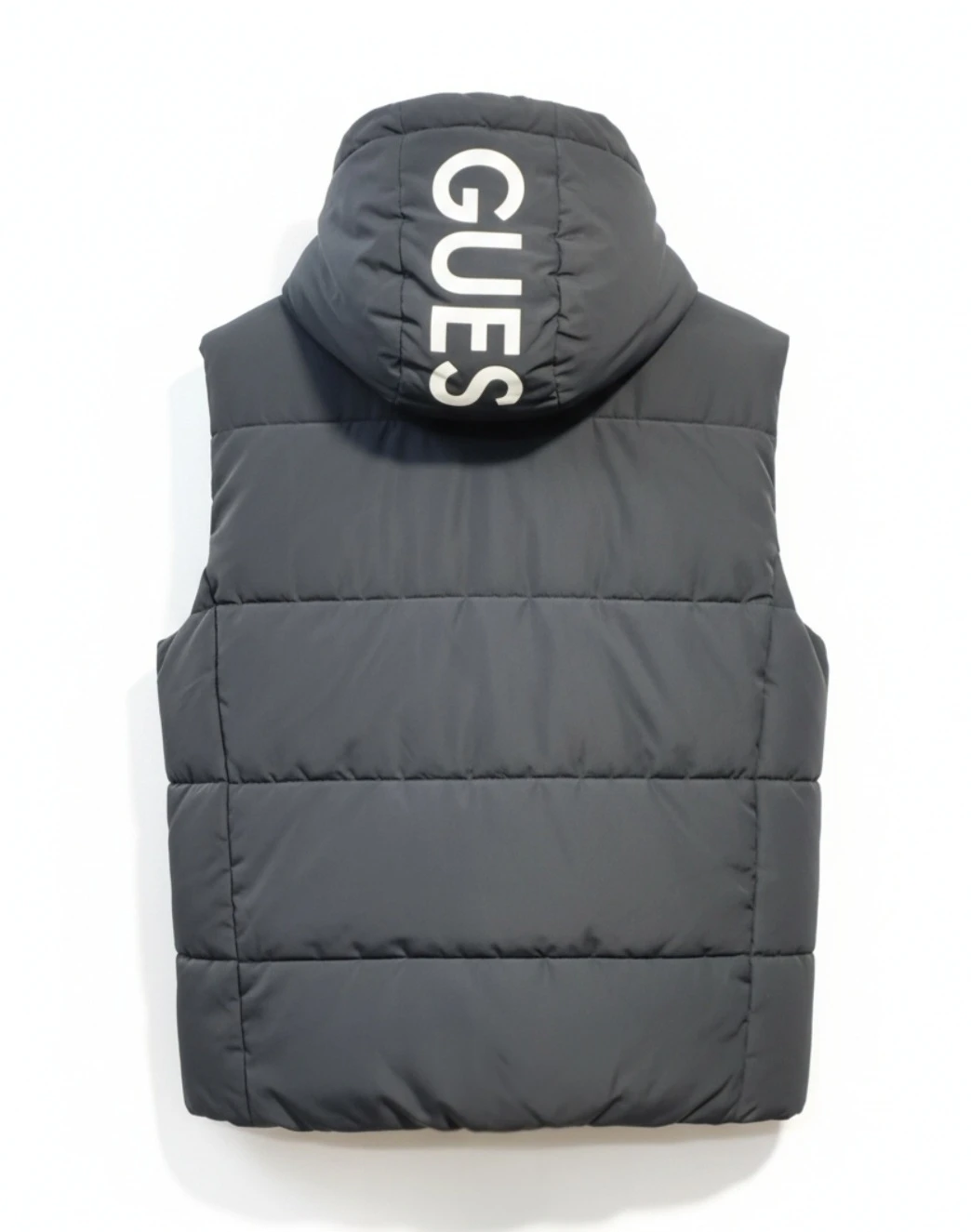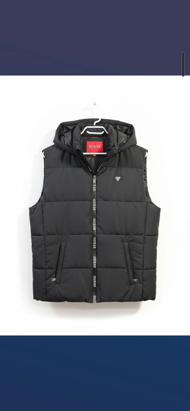 This is a black GUESS puffer vest. It's hooded and has a zipper closure. The vest has the GUESS logo printed on the zipper tape and on the hood. Puffer material for warmth.
