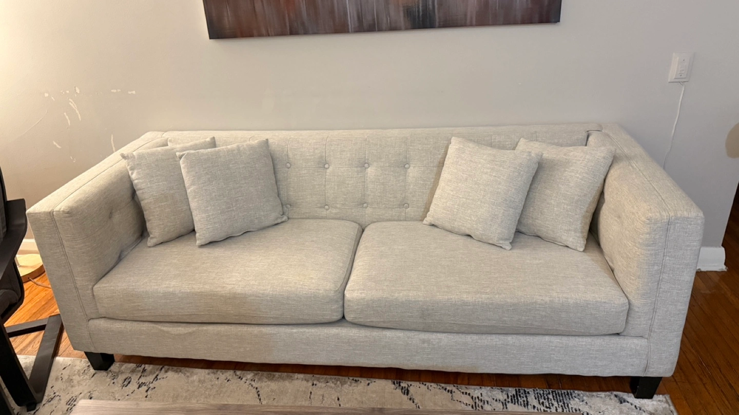 Need gone asap hence the price. Smoke-free pet-free home. Purchased 2.5 years ago from Leon’s for $1,200 plus tax. Used gently in a smoke-free pet-free home. In very good condition. No tear or wear, a couple of minor stains on cushions that would come out with a wash. All the pillow and seating cushion covers are removable with zippers and machine washable. Selling to replace with a sectional for more seating space. Pick up in Wortley Village. Also, check my seller profile for an IKEA poang bouncing chair and footrest in great condition.
