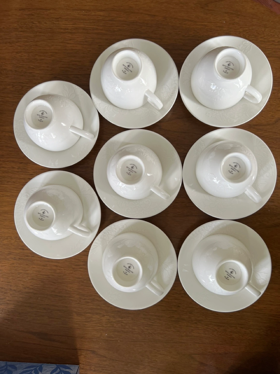 Set of 8 teacups and saucers. White with intricate embossed floral design. Fine bone china. Excellent for fine or casual dining. Microwave safe and dishwasher safe.