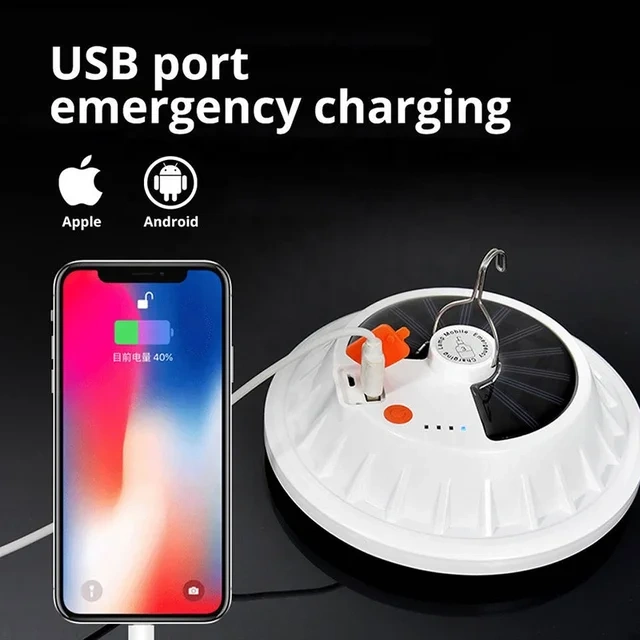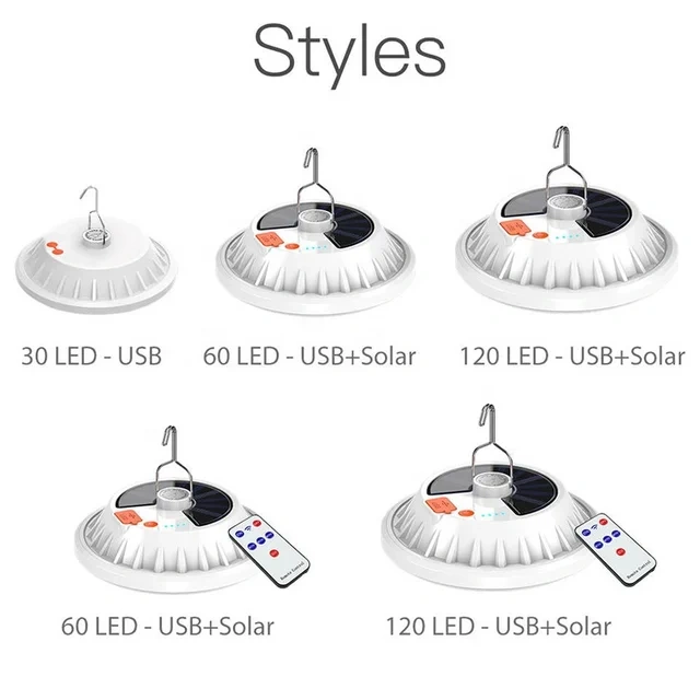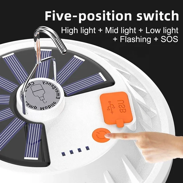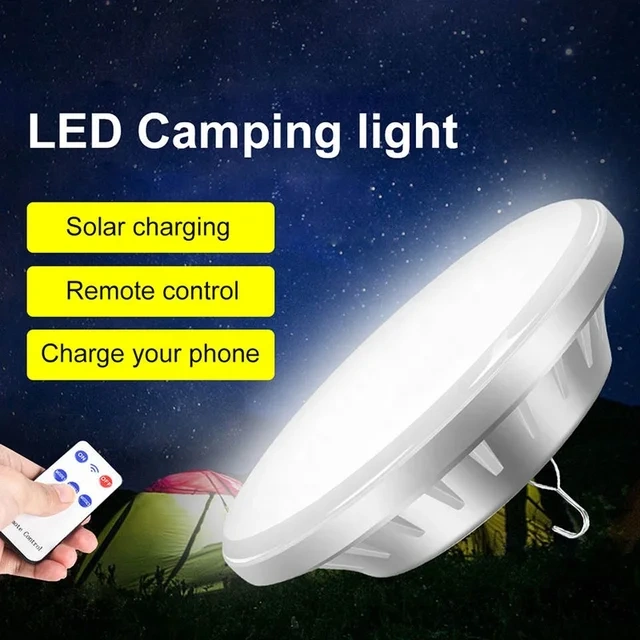 Solar powered camping light with remote control. Charge your phone with the built-in USB port. Five-position switch: high light, mid light, low light, flashing, and SOS.