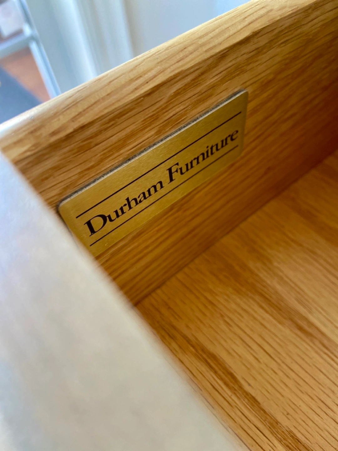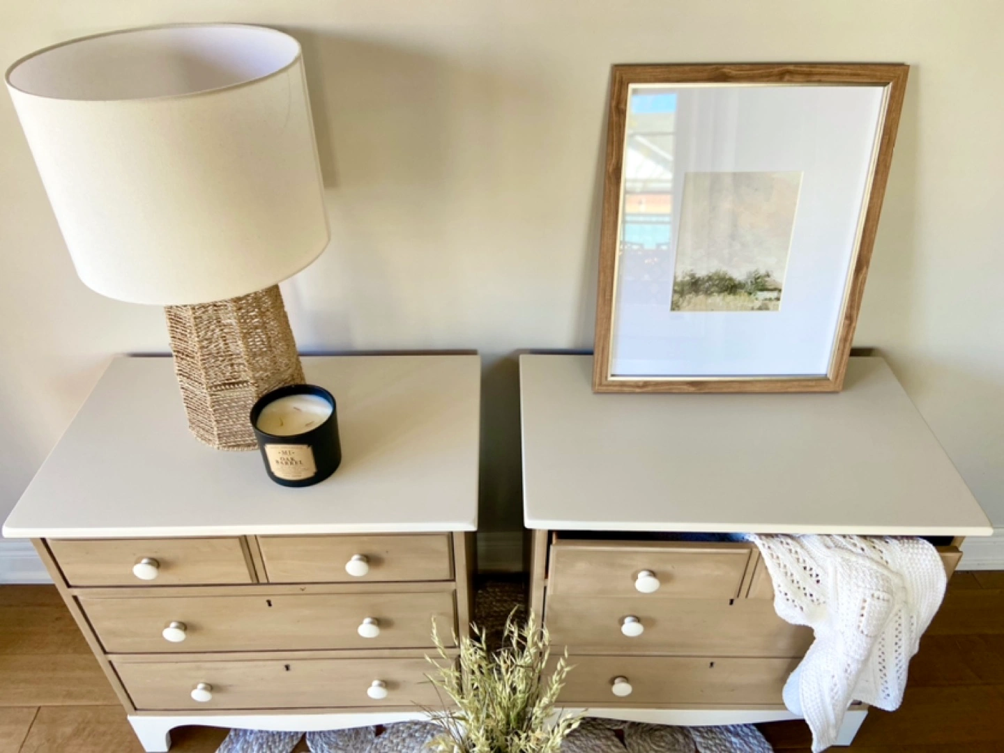 Newly refinished "Durham Furniture" nightstands, made in Canada & solid wood. Excellent storage solution featuring 3 large drawers each. The body of the pieces were stripped of their previous finish and restained in a modern tan-shade. The tops and bottoms of the nighstands were painted in a light, warm neutral colour called "natural linen". Both pieces were sealed for long-lasting durability. Beautiful statement pieces for a bedroom.