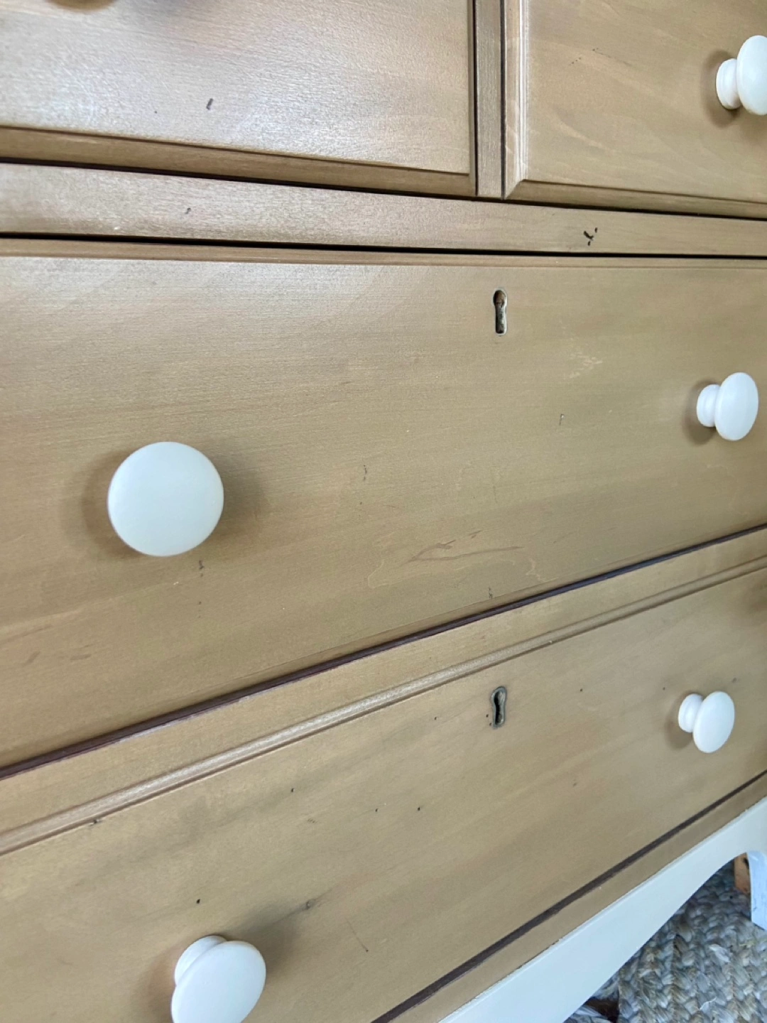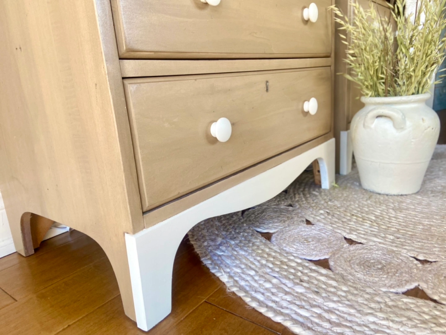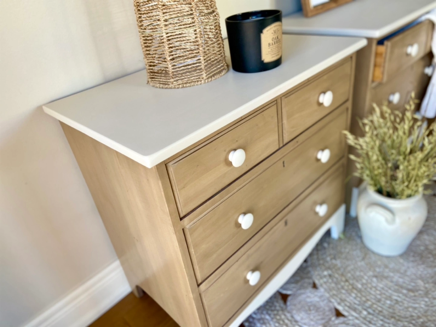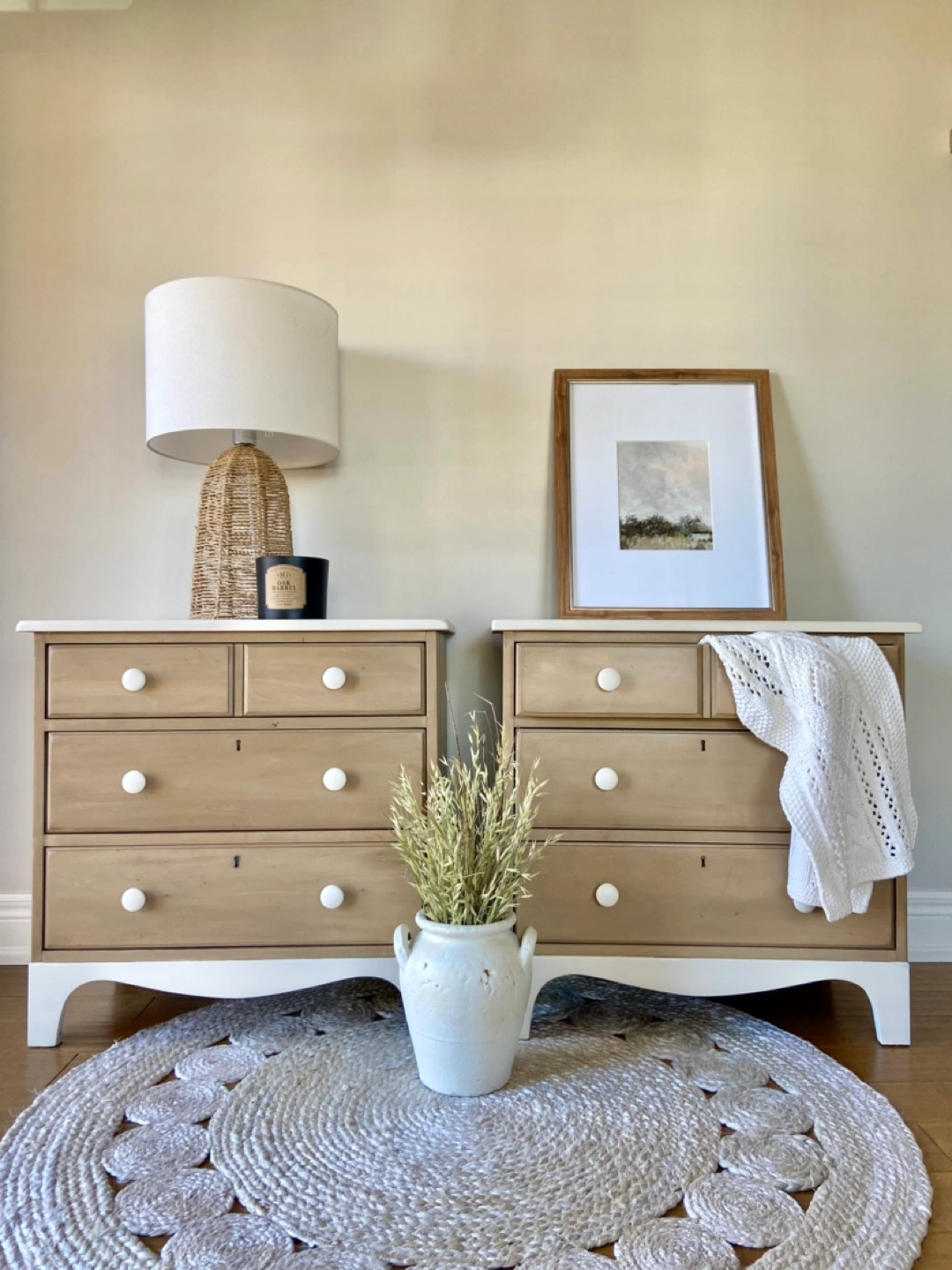 Newly refinished "Durham Furniture" nightstands, made in Canada & solid wood. Excellent storage solution featuring 3 large drawers each. The body of the pieces were stripped of their previous finish and restained in a modern tan-shade. The tops and bottoms of the nighstands were painted in a light, warm neutral colour called "natural linen". Both pieces were sealed for long-lasting durability. Beautiful statement pieces for a bedroom.