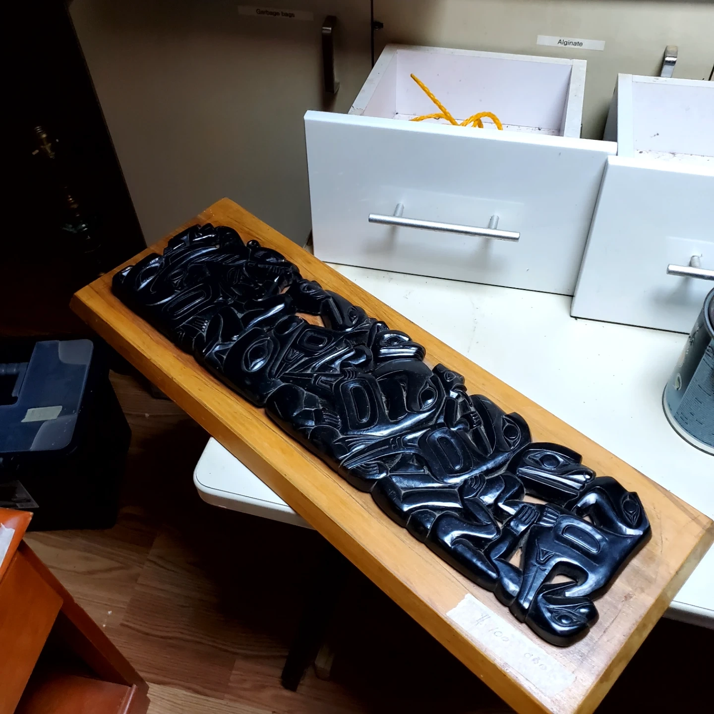 This is a black carved art piece featuring Indigenous motifs, mounted on a light wooden base. It displays intricate details and traditional imagery. It's suitable for home decor or as a statement piece. It's very heavy, not sure of the stone.