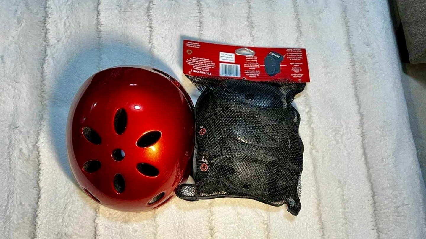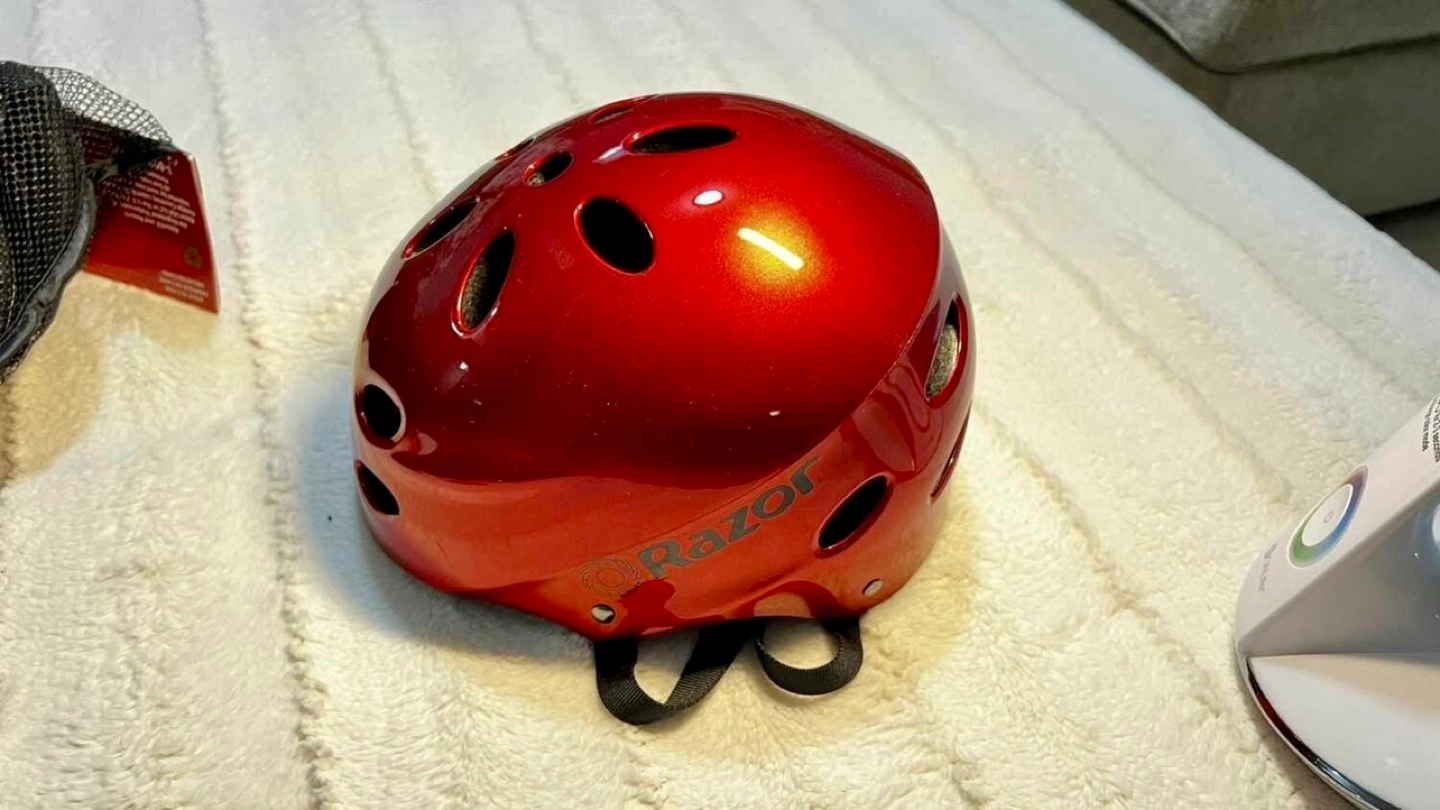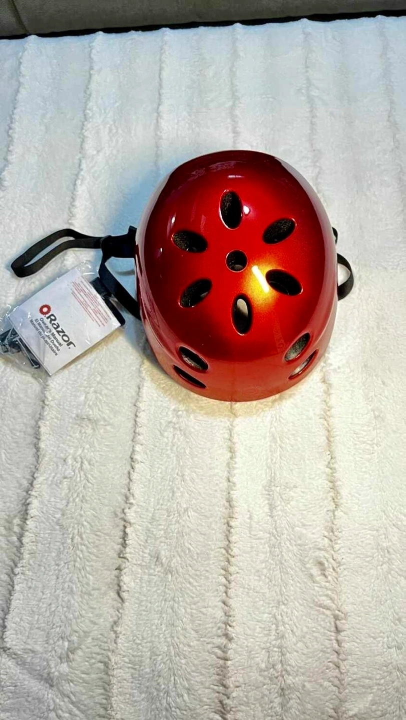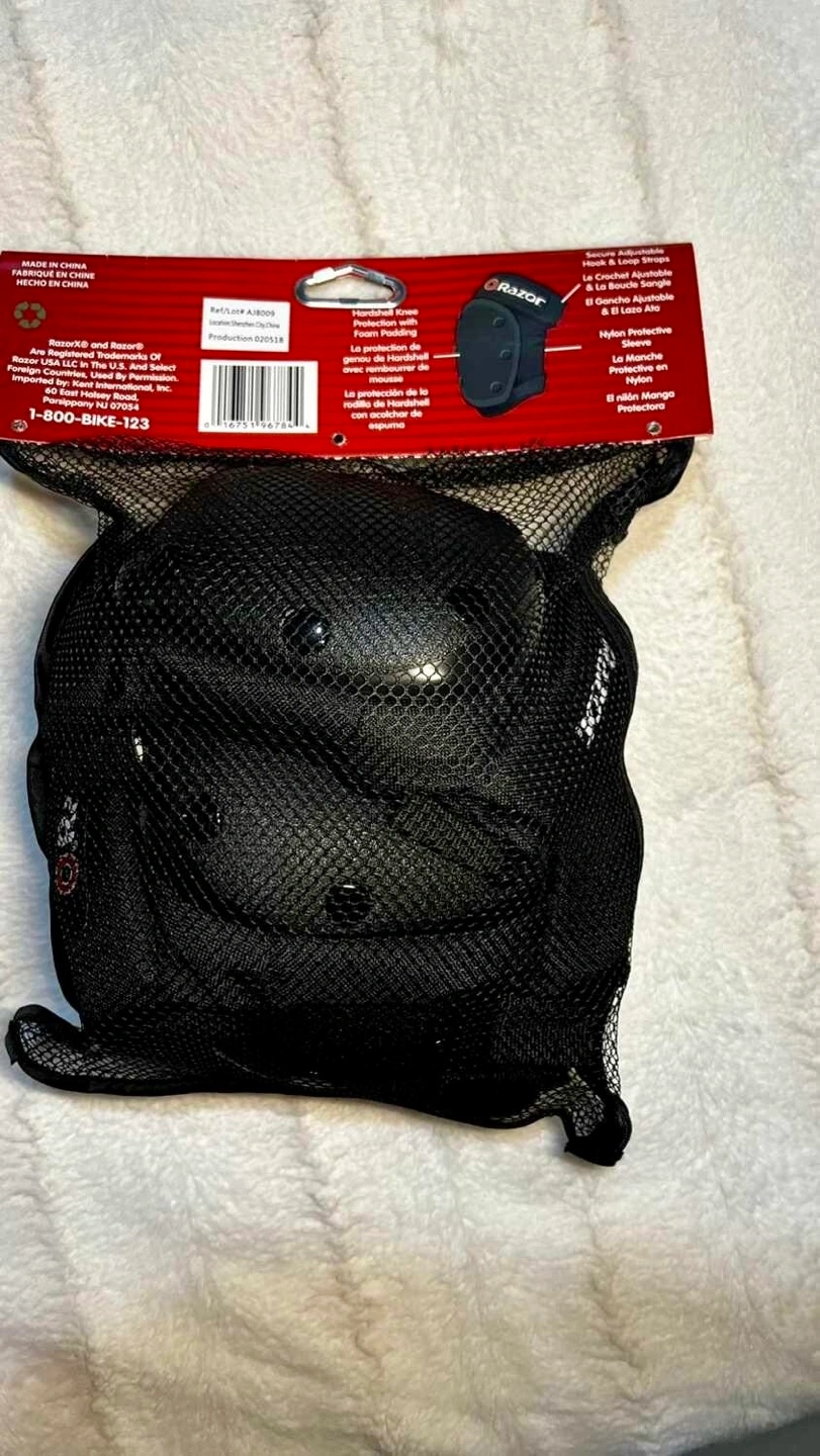 218Brand new, never used, original packaging Razor brand protective helmet and protective knee and elbow pads Helmet is multi-sport helmet with 17 vents for extra air circulation Cpsc Approved Comes with removable or extra foam padding to adjust to each individual head and an adjustable clip-in chin strap Sleek red gloss finish (fierce!) Fits youth ages 8 – 14 Protective pads - feature both knee and elbow pads with thicker foam cushion to absorb impact Hard plastic slideable caps to deflect impact Hook and loop fastened straps to secure and heavy stitching and riveted caps for durability Soft fleece interior comforts and absorbs sweat Fits ages 8 and up Perfect gift for a scooter/skateboard fans From a smoke/pet free home