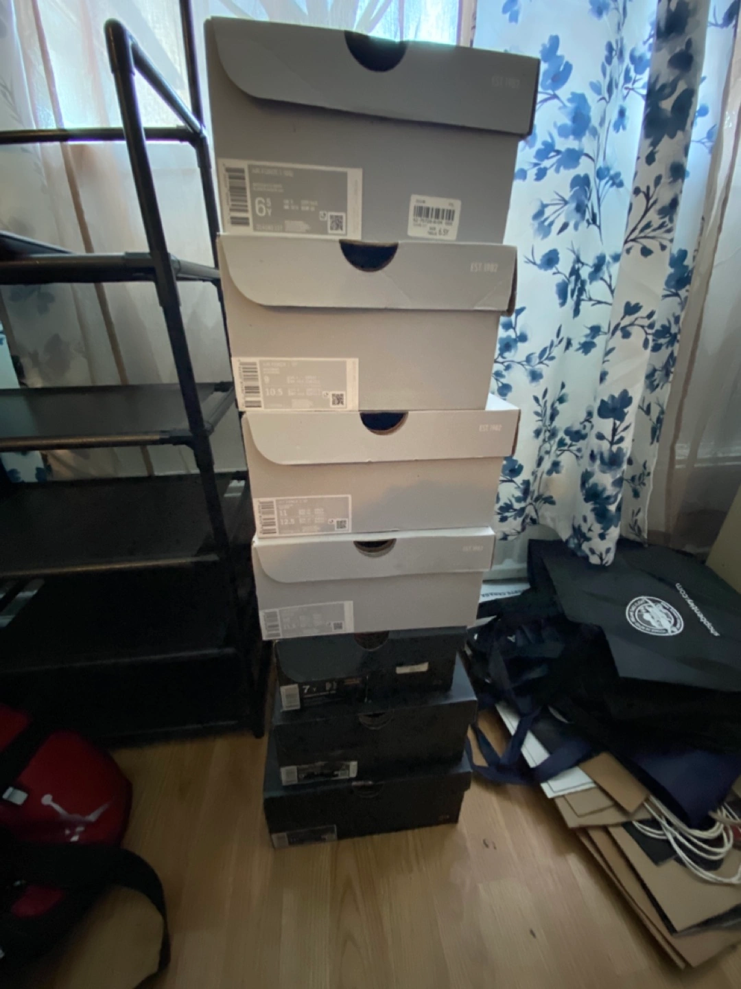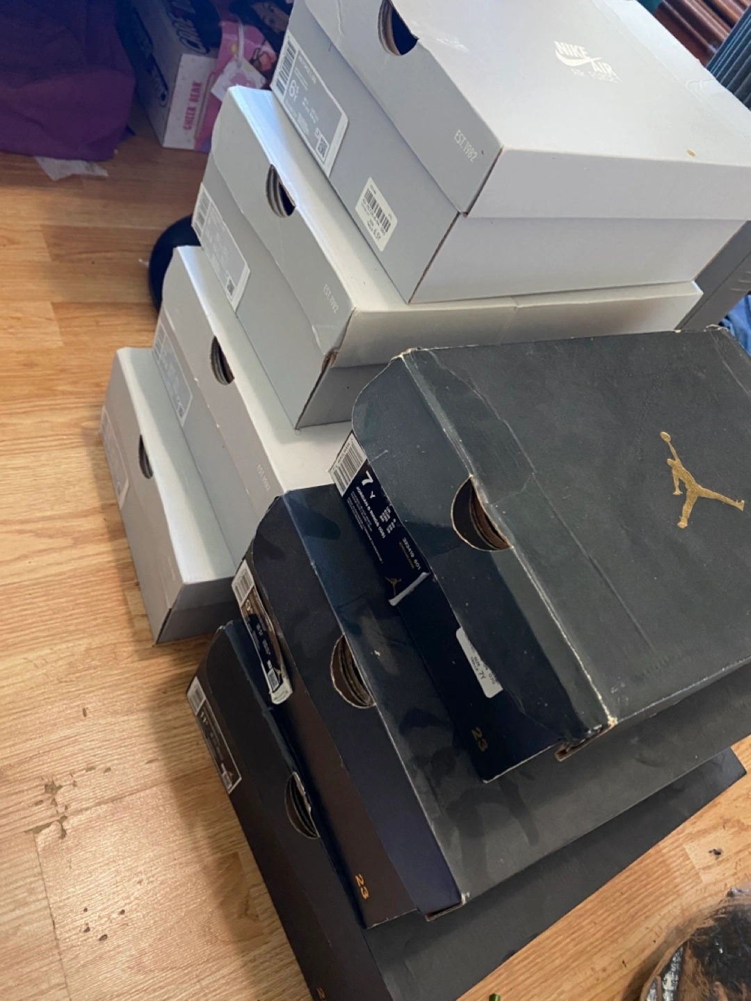 142Stack of shoe boxes. Mostly Nike and a few Air Jordan. All empty.